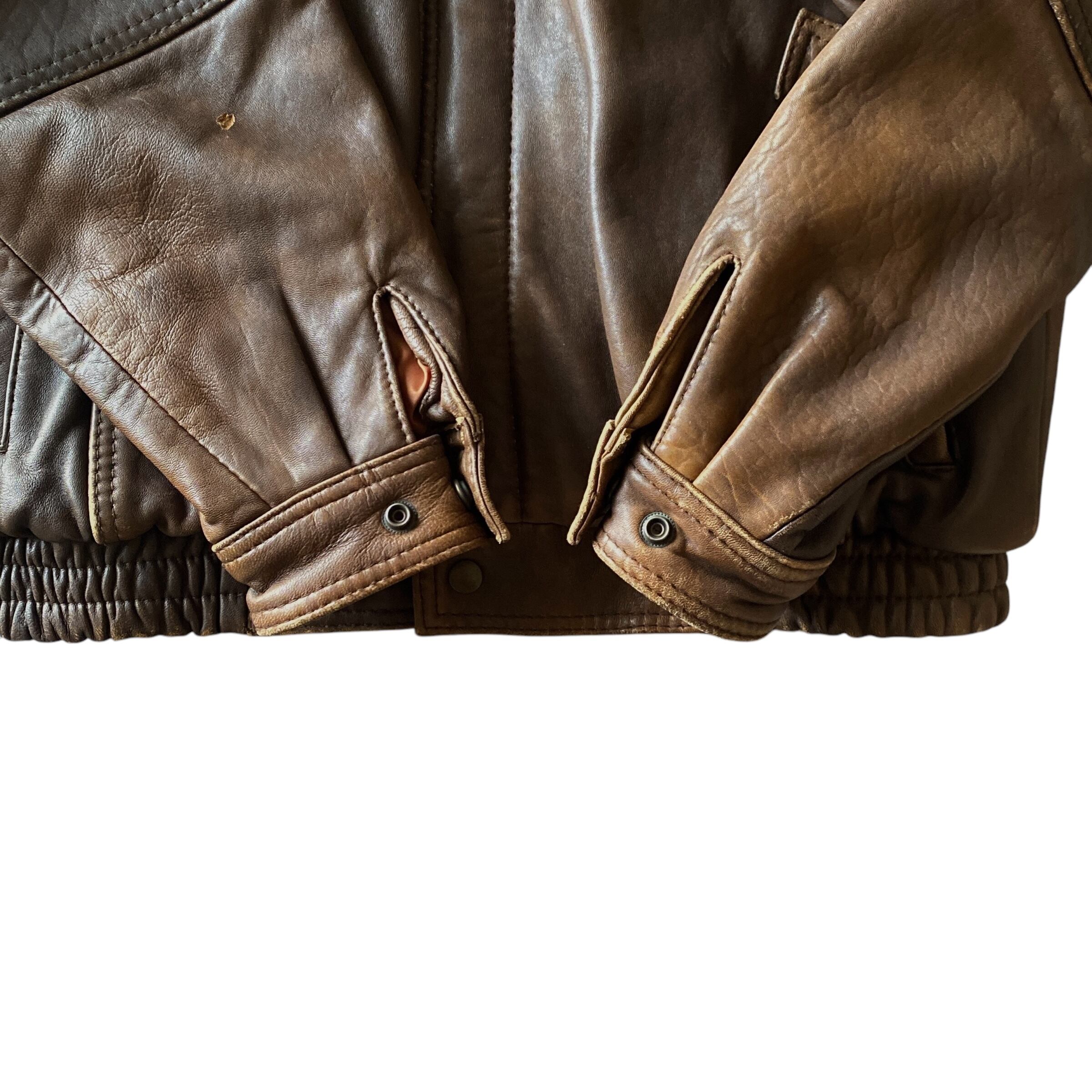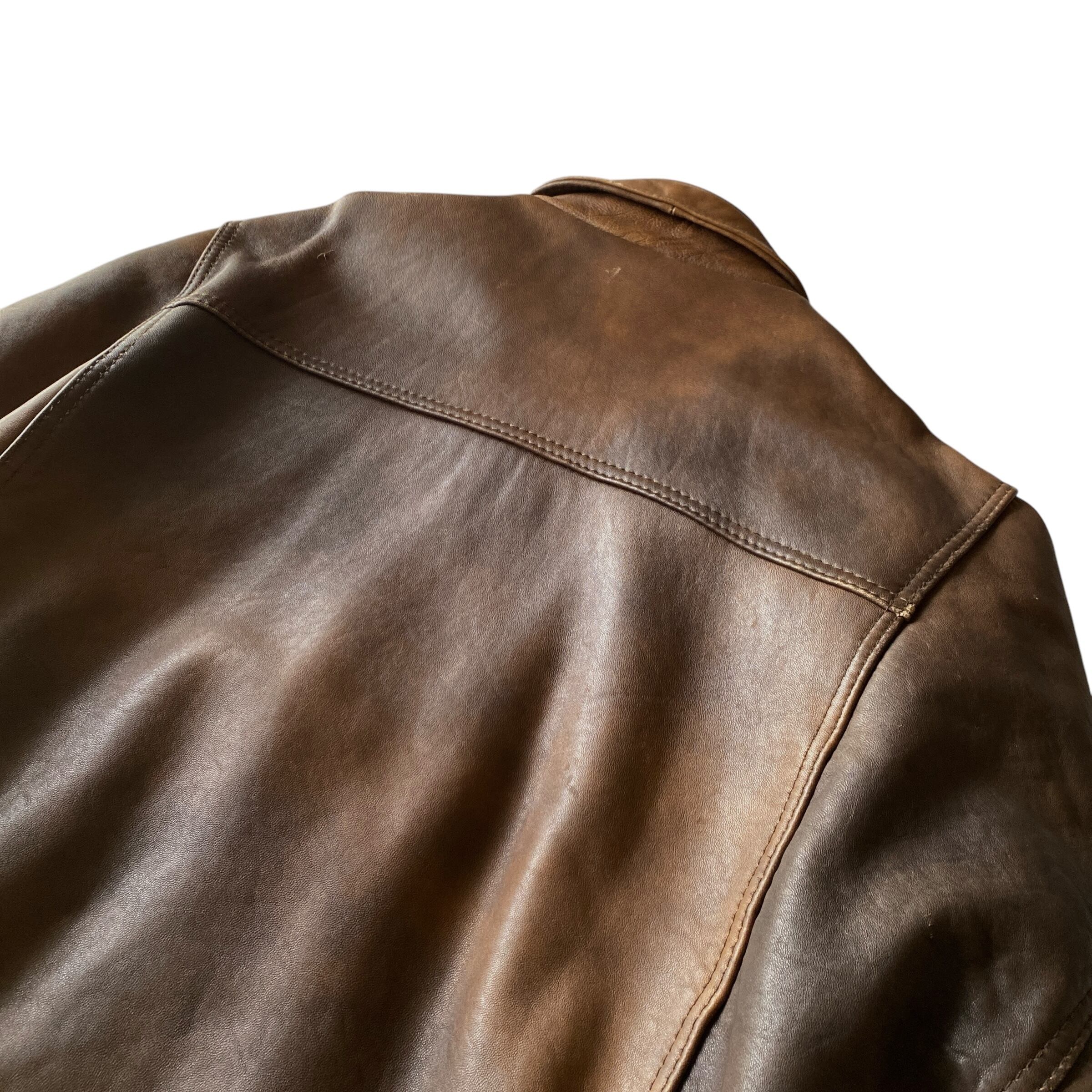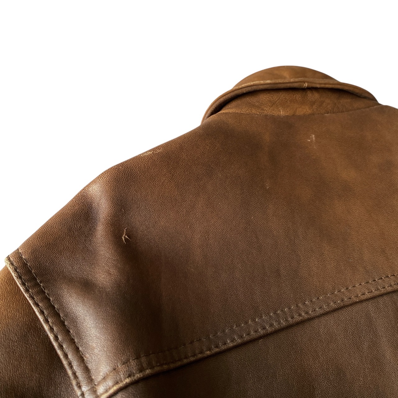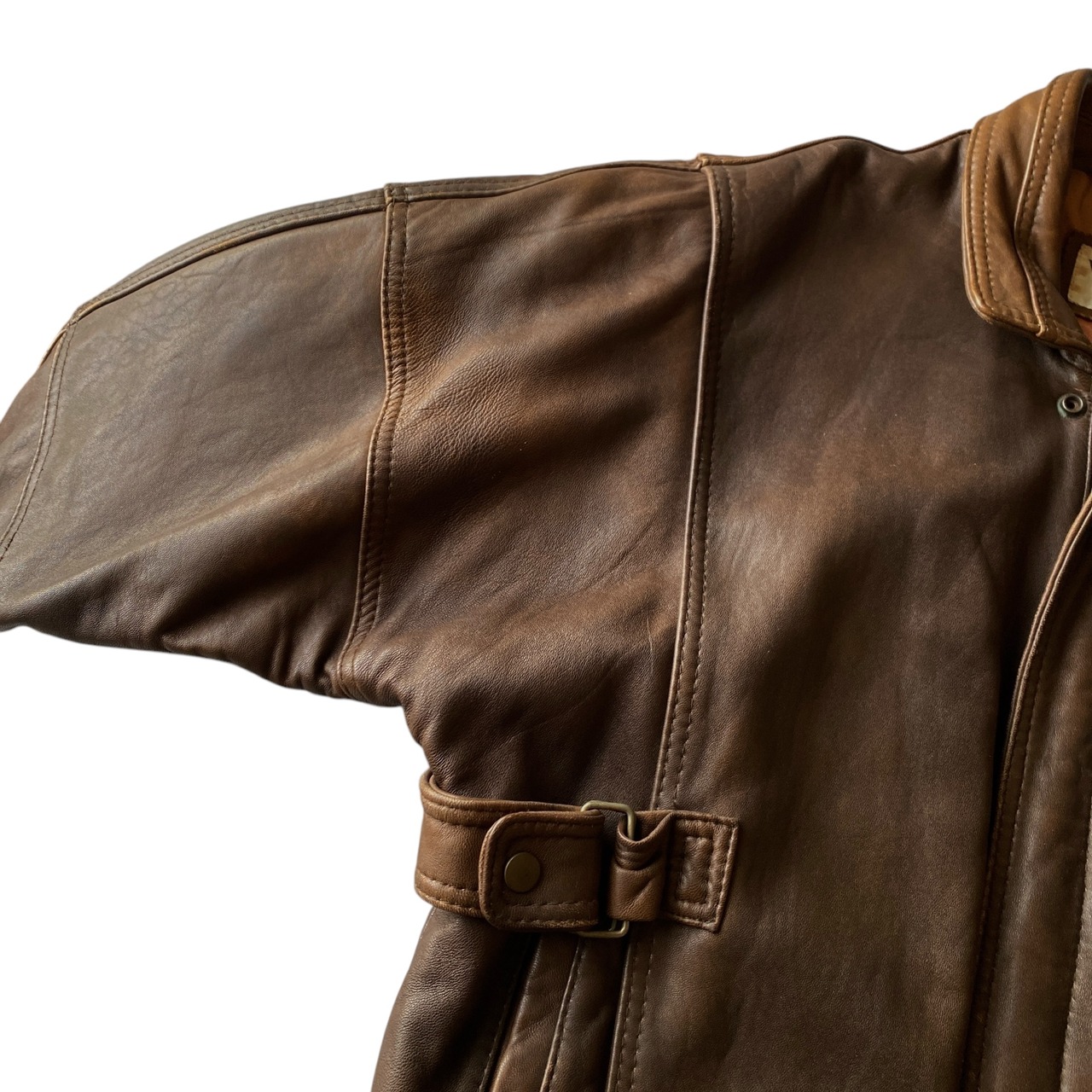 非常に肉厚で柔らかい上質なラムレザーに、ムラ感のあるブラウンの色目、ドルマンスリーブのような80sらしい短丈ボックスなシルエットが非常に格好良い一着。