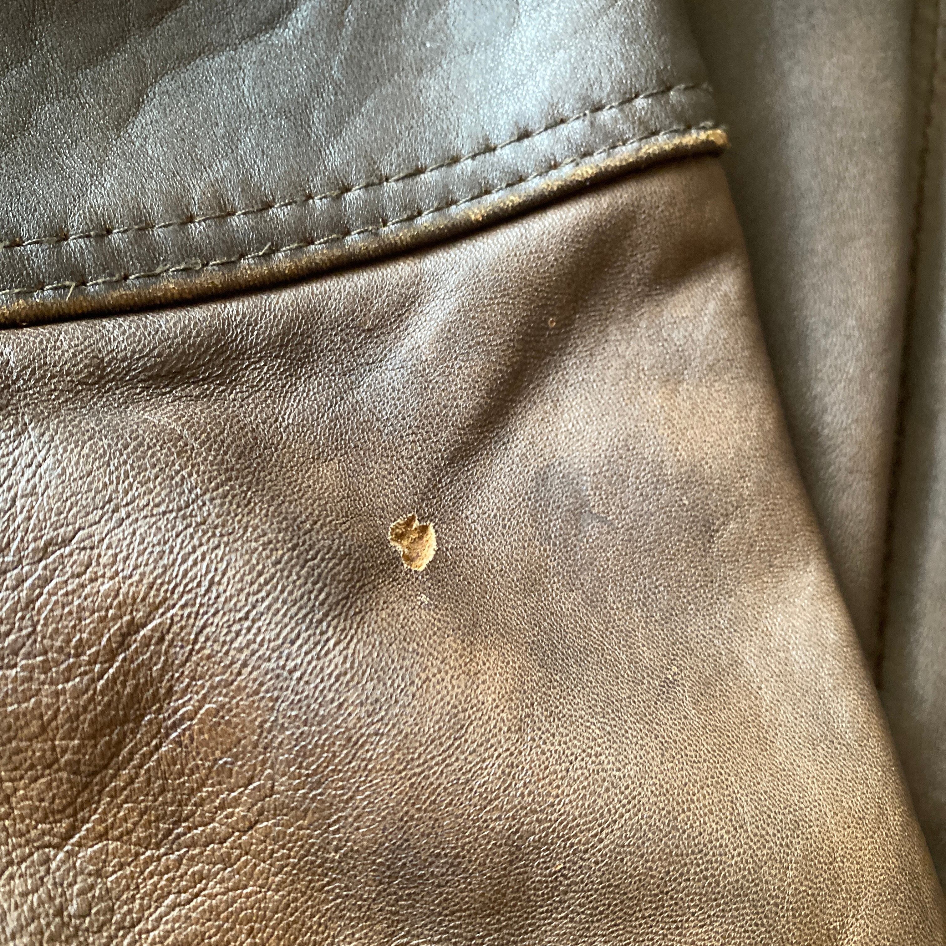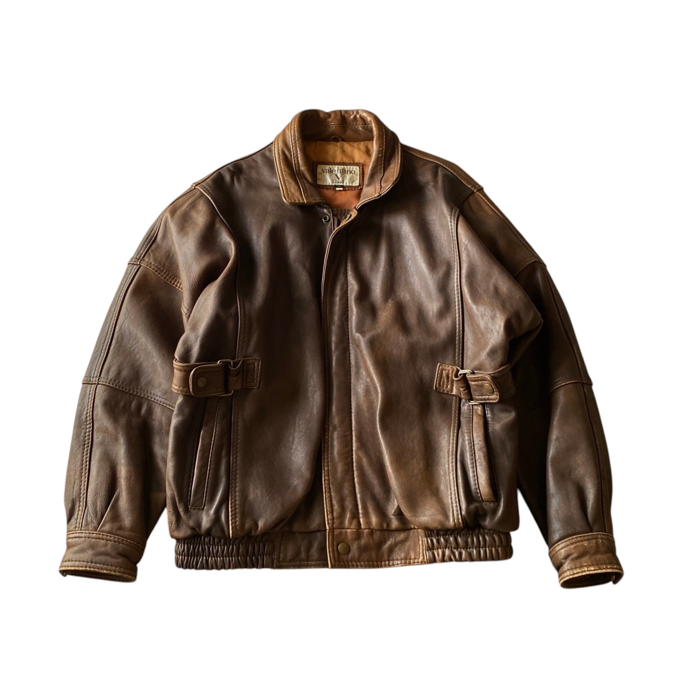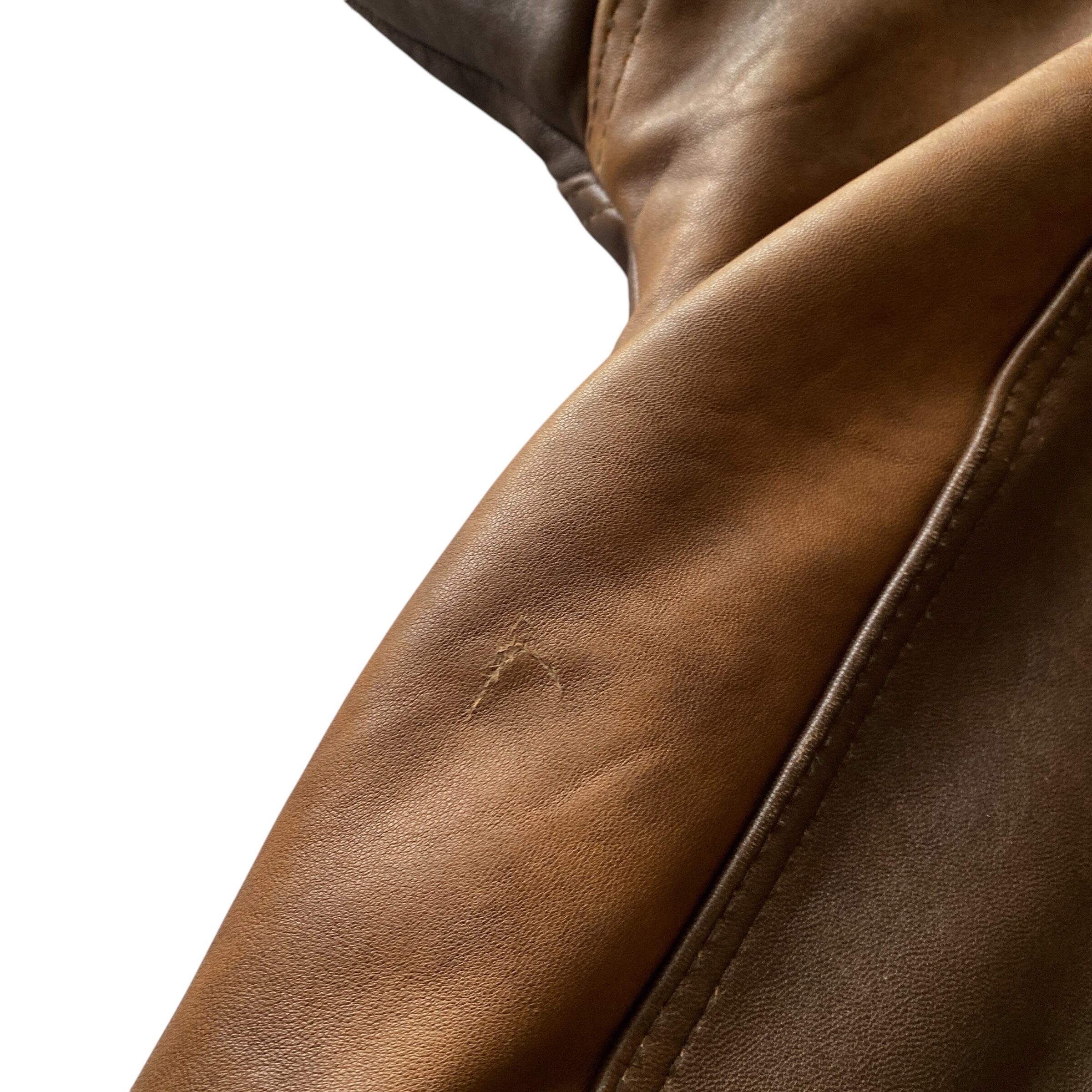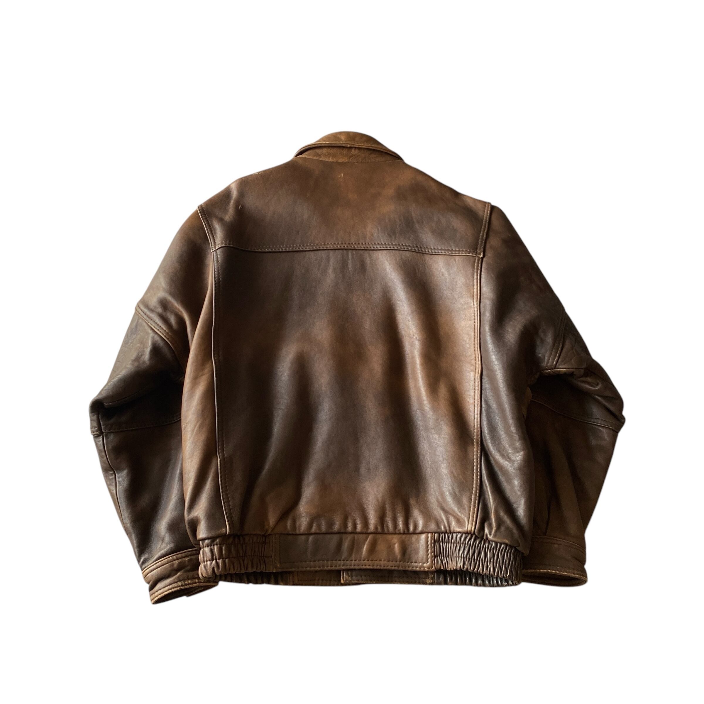 非常に肉厚で柔らかい上質なラムレザーに、ムラ感のあるブラウンの色目、ドルマンスリーブのような80sらしい短丈ボックスなシルエットが非常に格好良い一着。