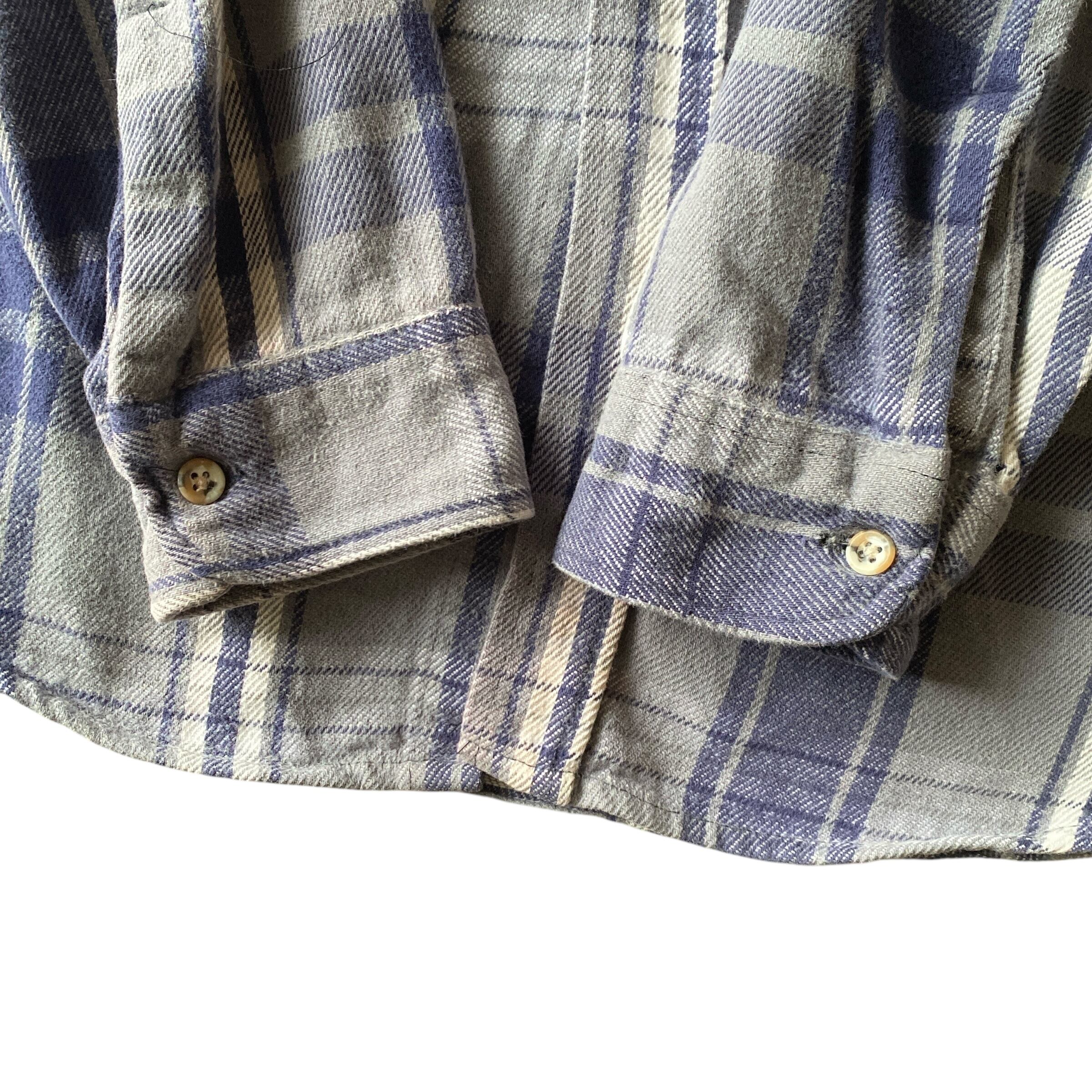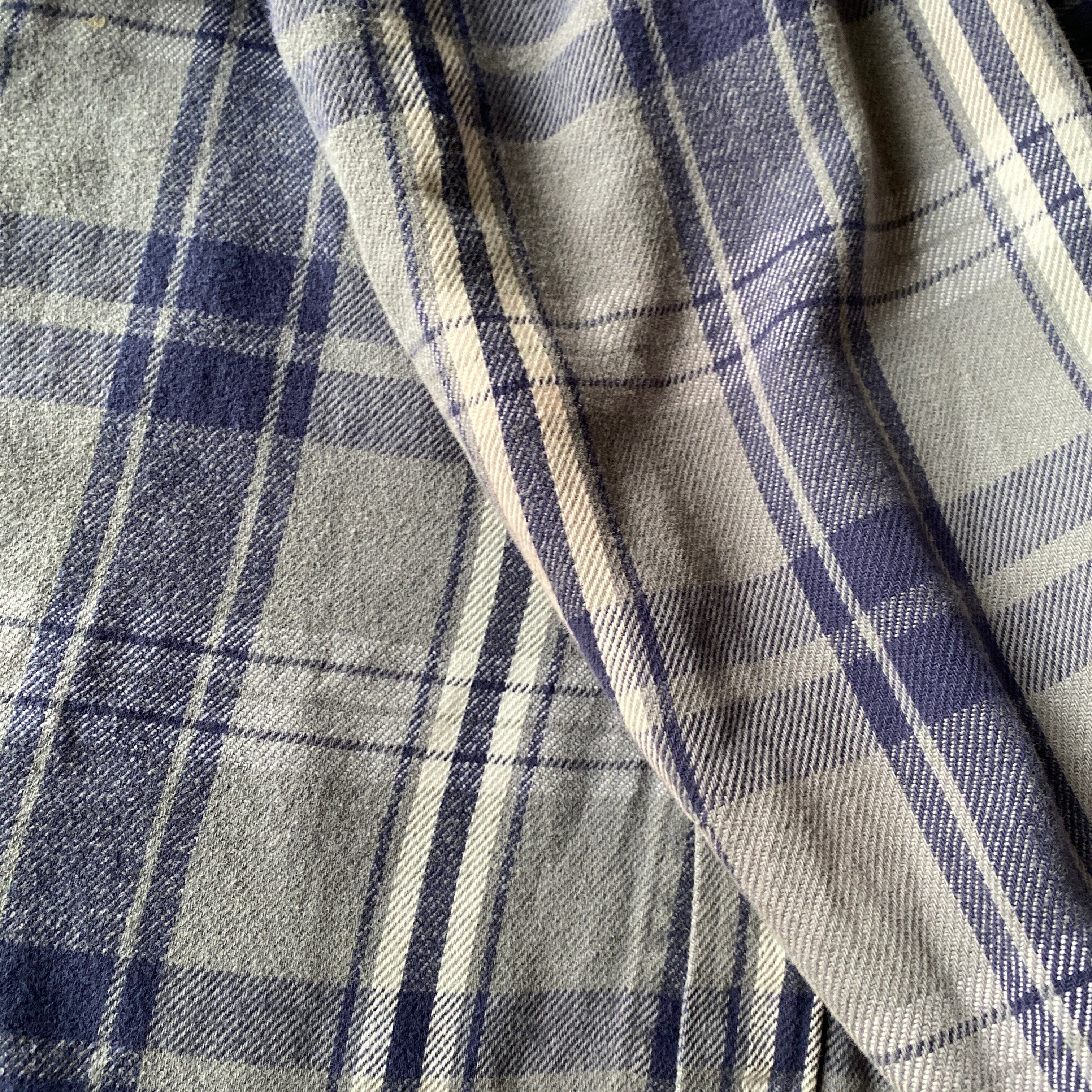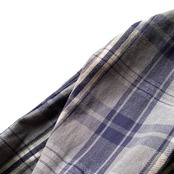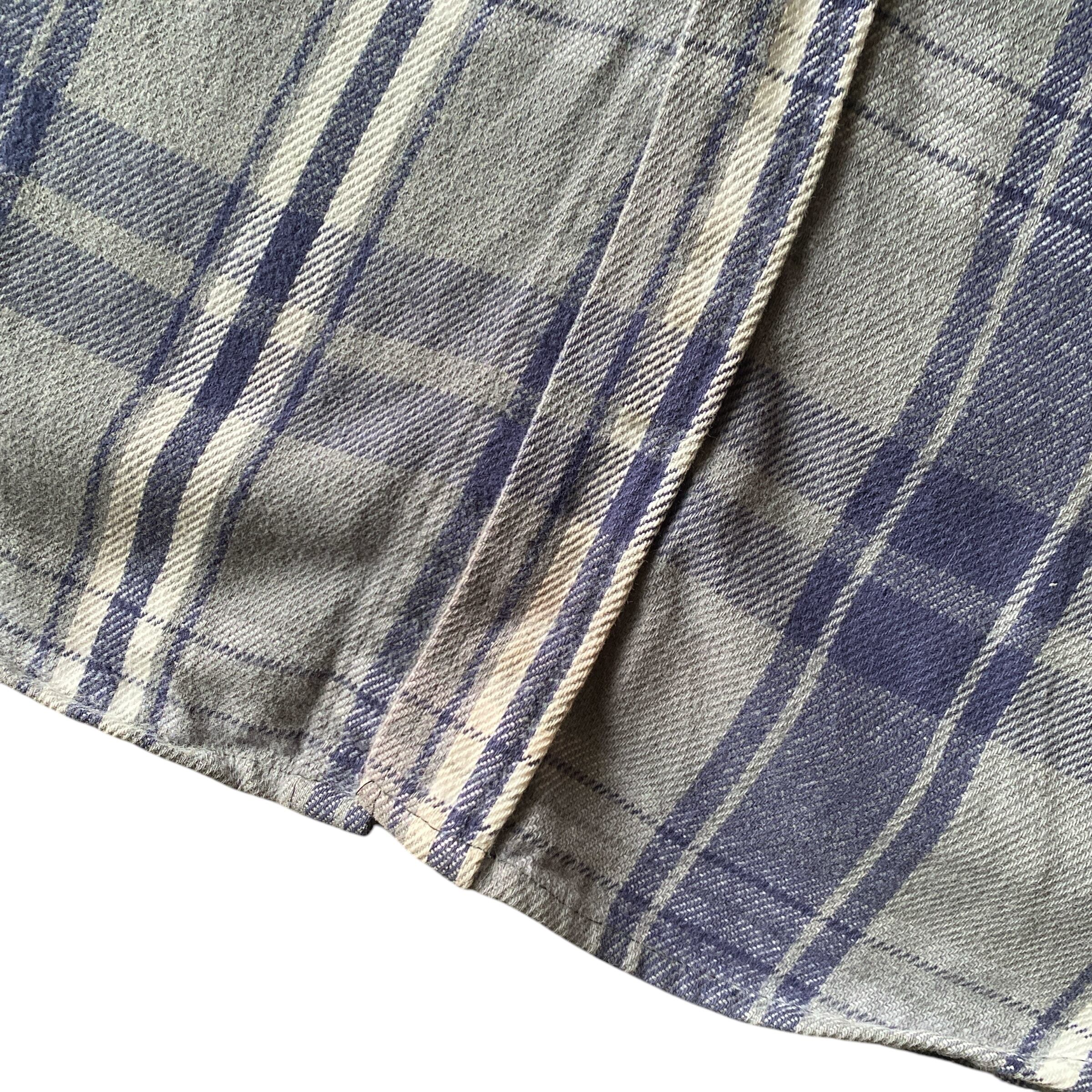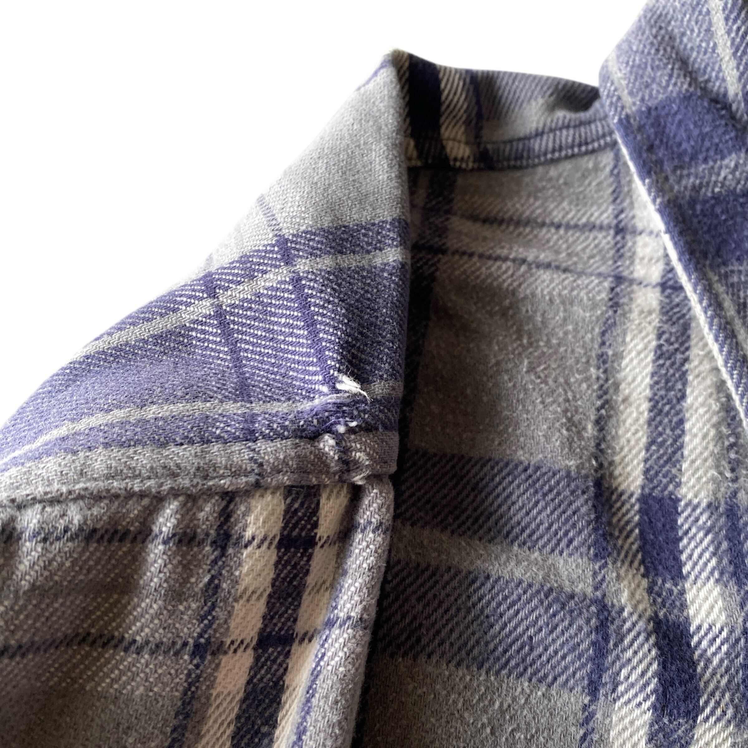 肉厚でモチッとした風合いの良いコットンフランネル生地に、グレー×ホワイト×ネイビーパープルの好配色が非常に格好良い一着。