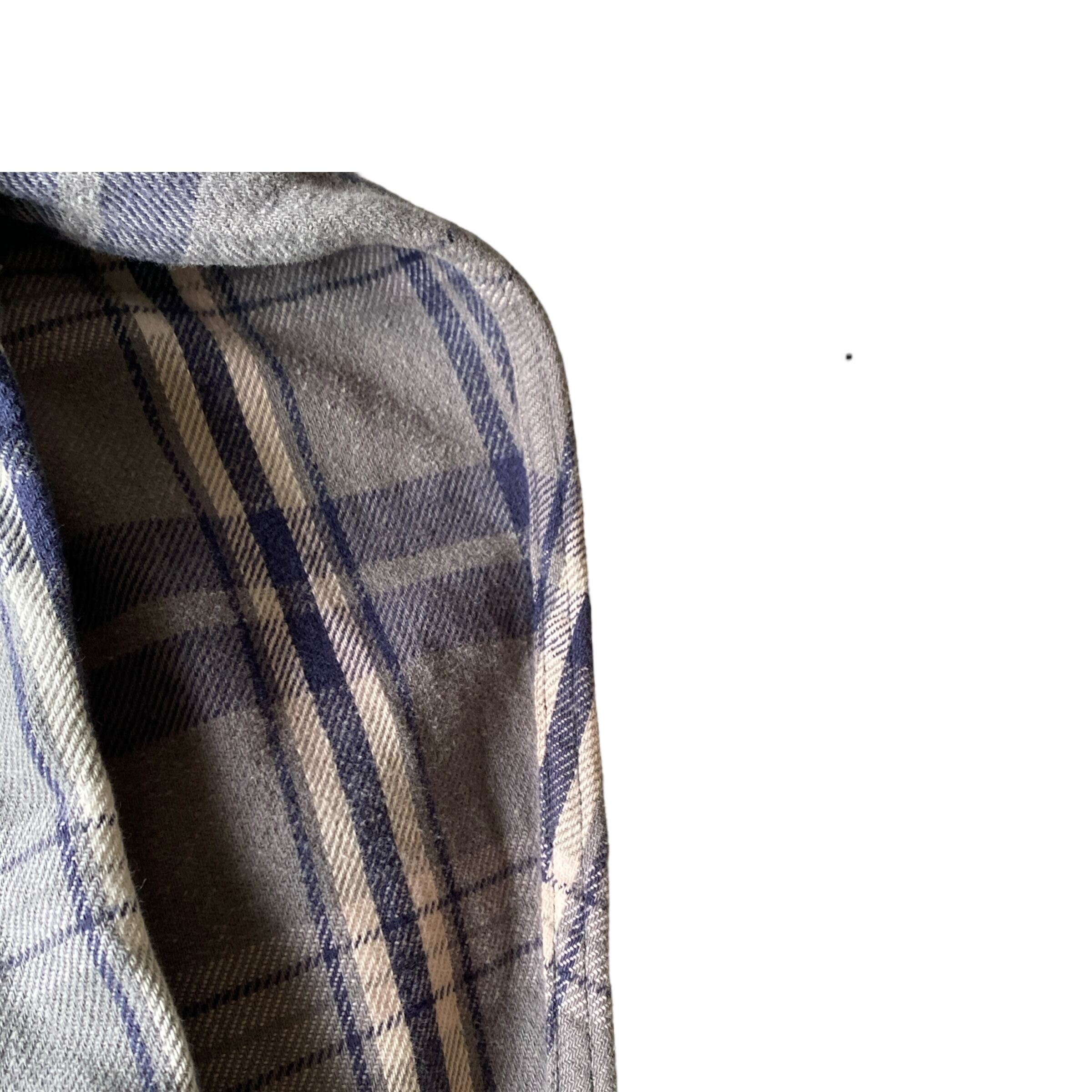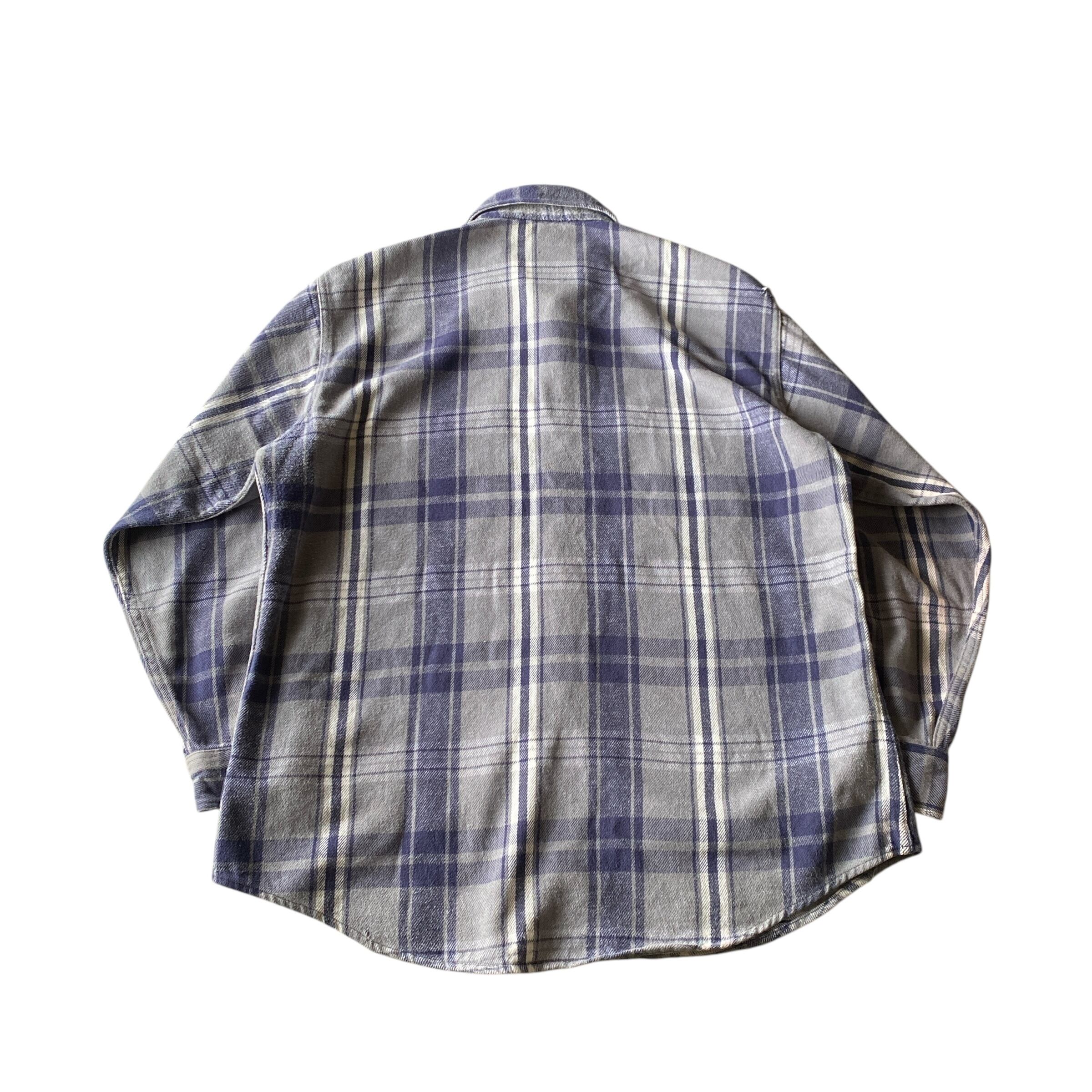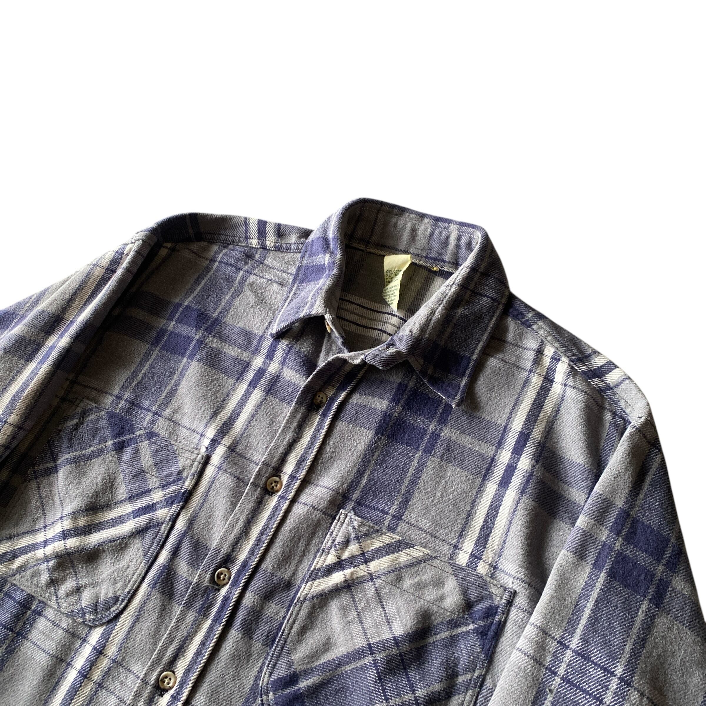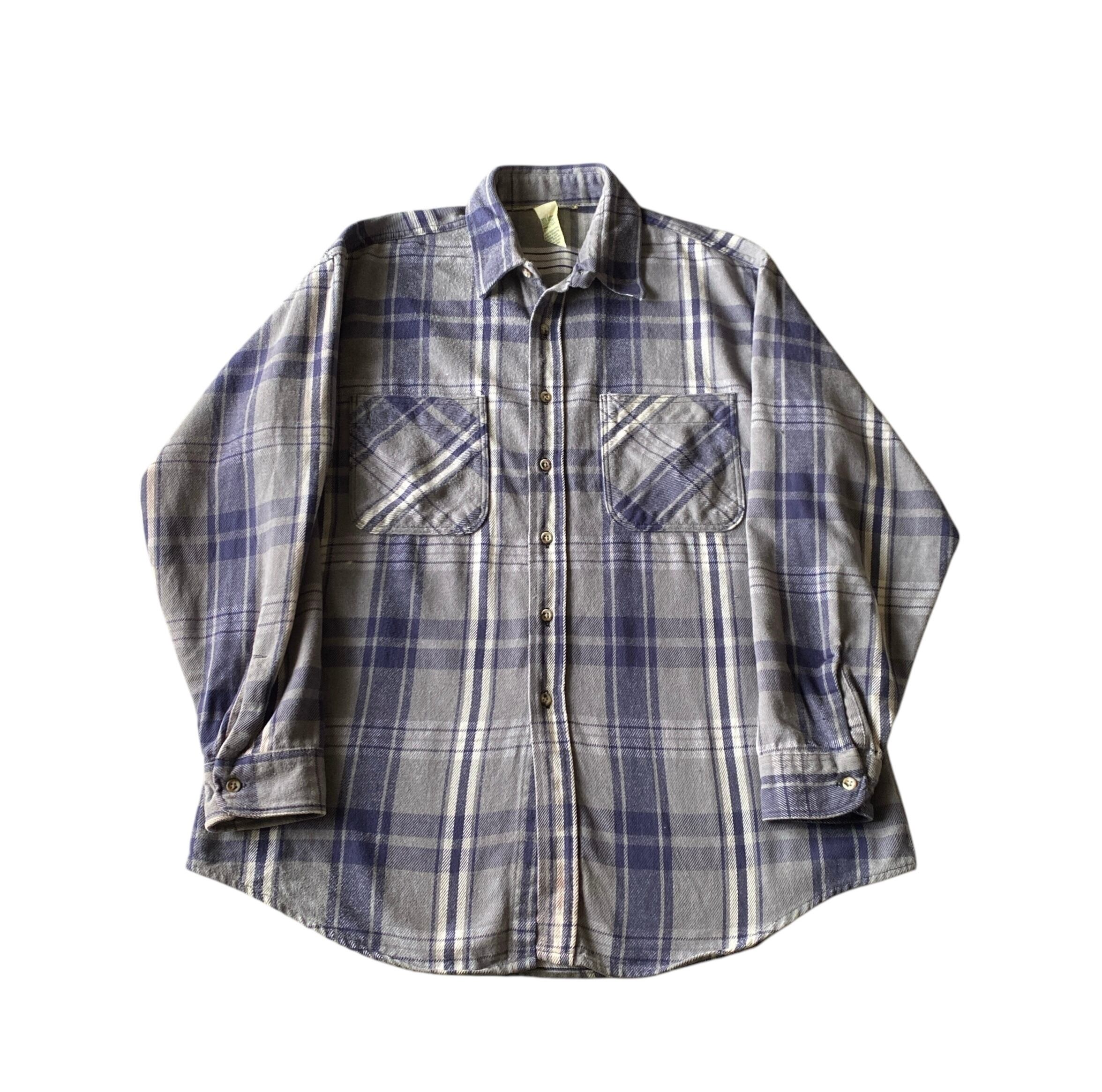 肉厚でモチッとした風合いの良いコットンフランネル生地に、グレー×ホワイト×ネイビーパープルの好配色が非常に格好良い一着。