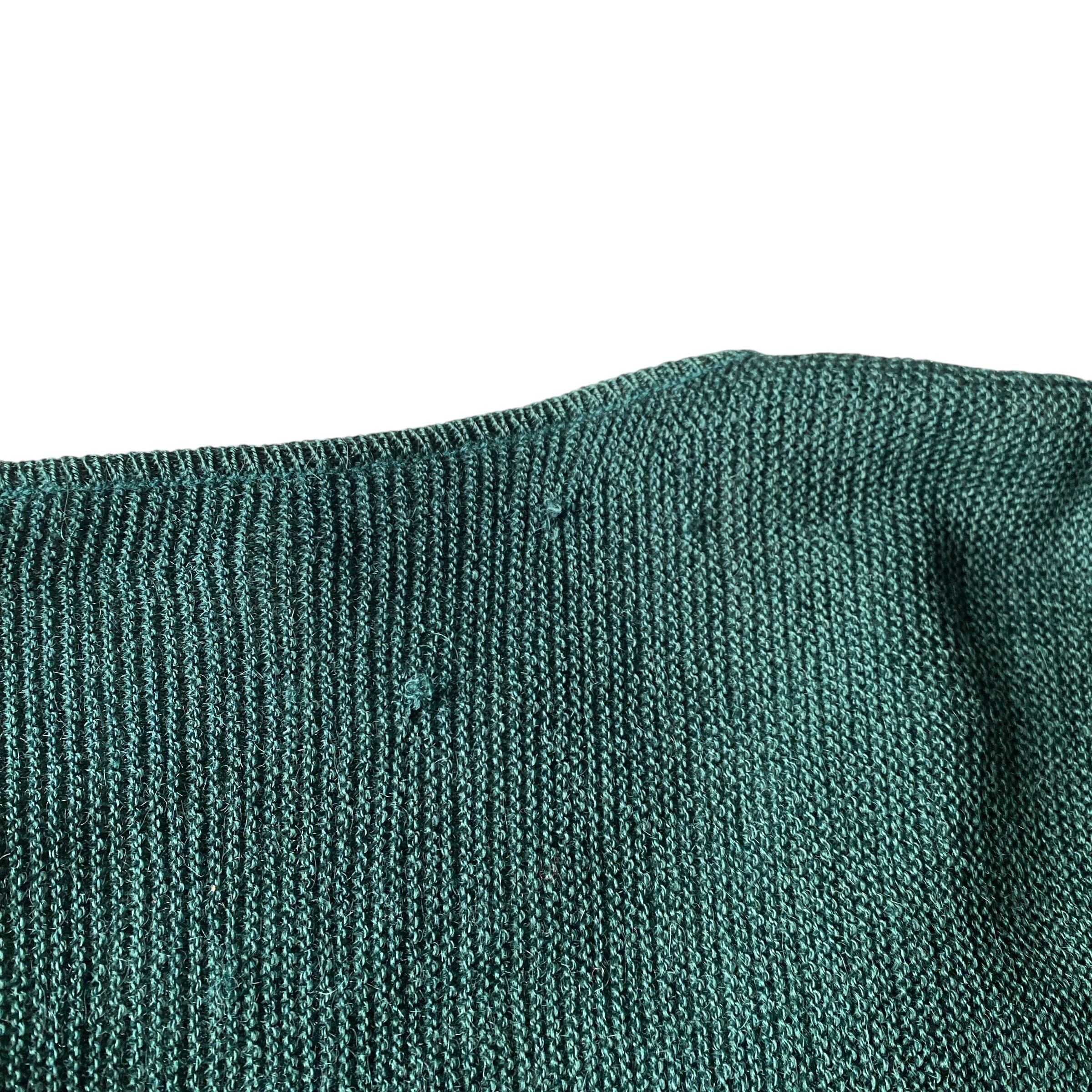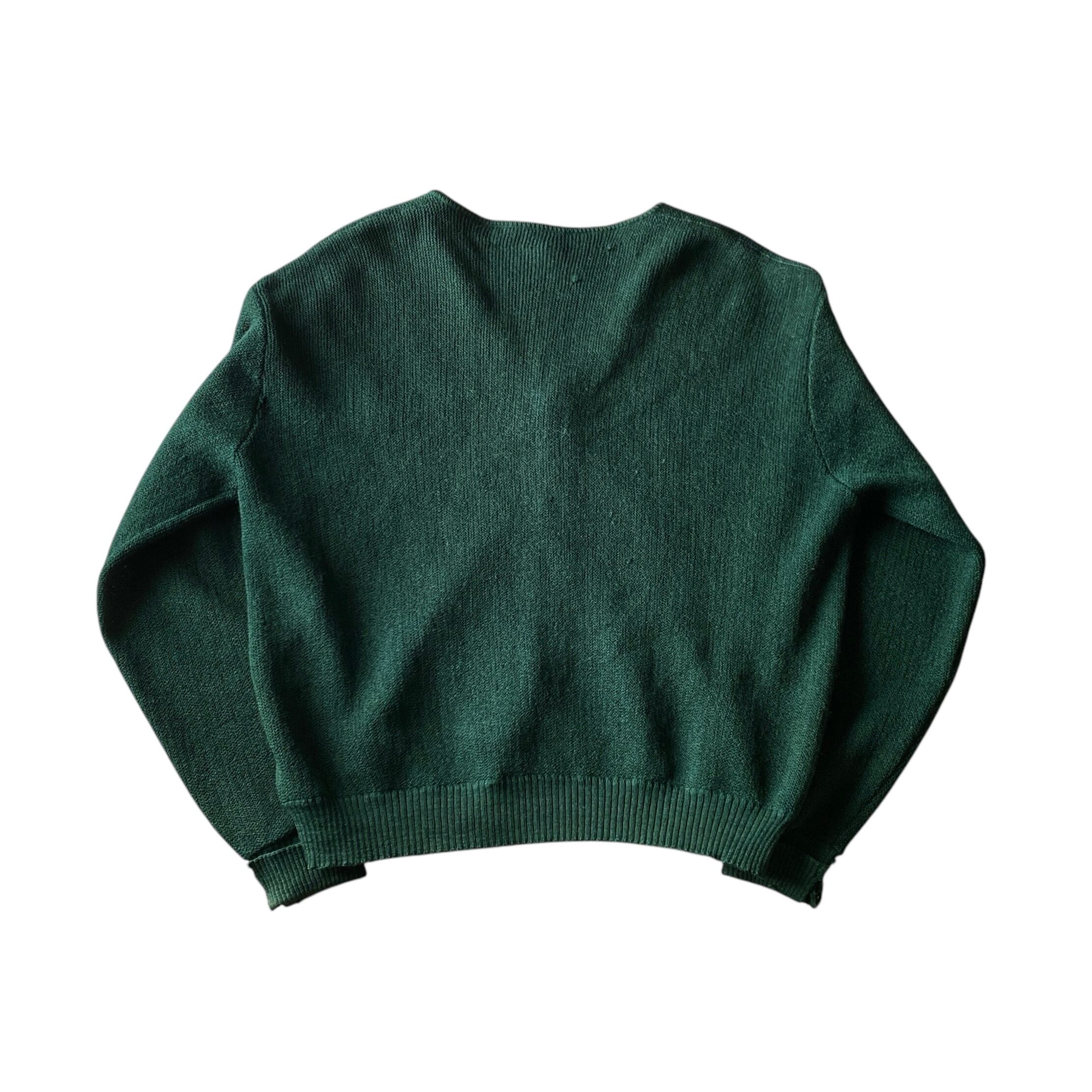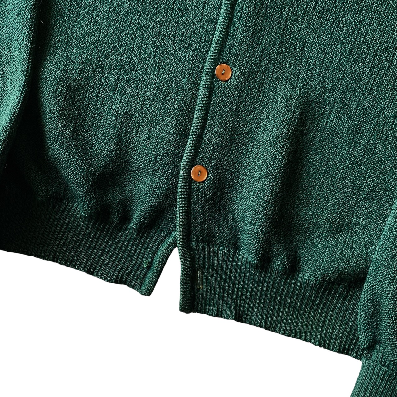 ウール×モヘアのツルッとしたコシのある上質なニット地に、複雑で深みのあるダークグリーンカラー、丸みのある短丈ボックスなシルエットが非常に格好良い一着。
