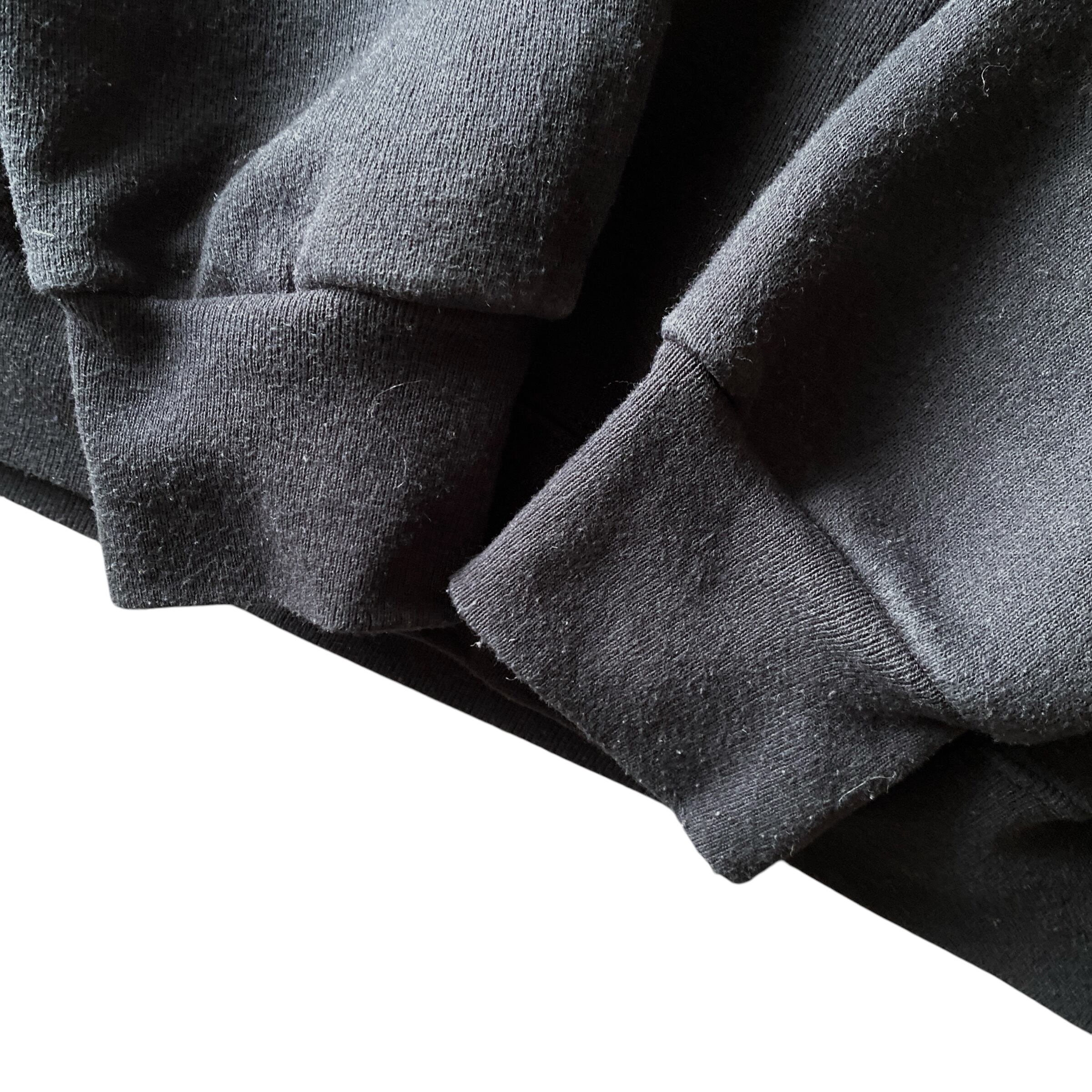 ベーシックなブラックカラーに、おそらく9ozぐらいで厚みで、コットンポリ特有の柔らかくやや落ち感のある生地が非常に良い塩梅の一着。