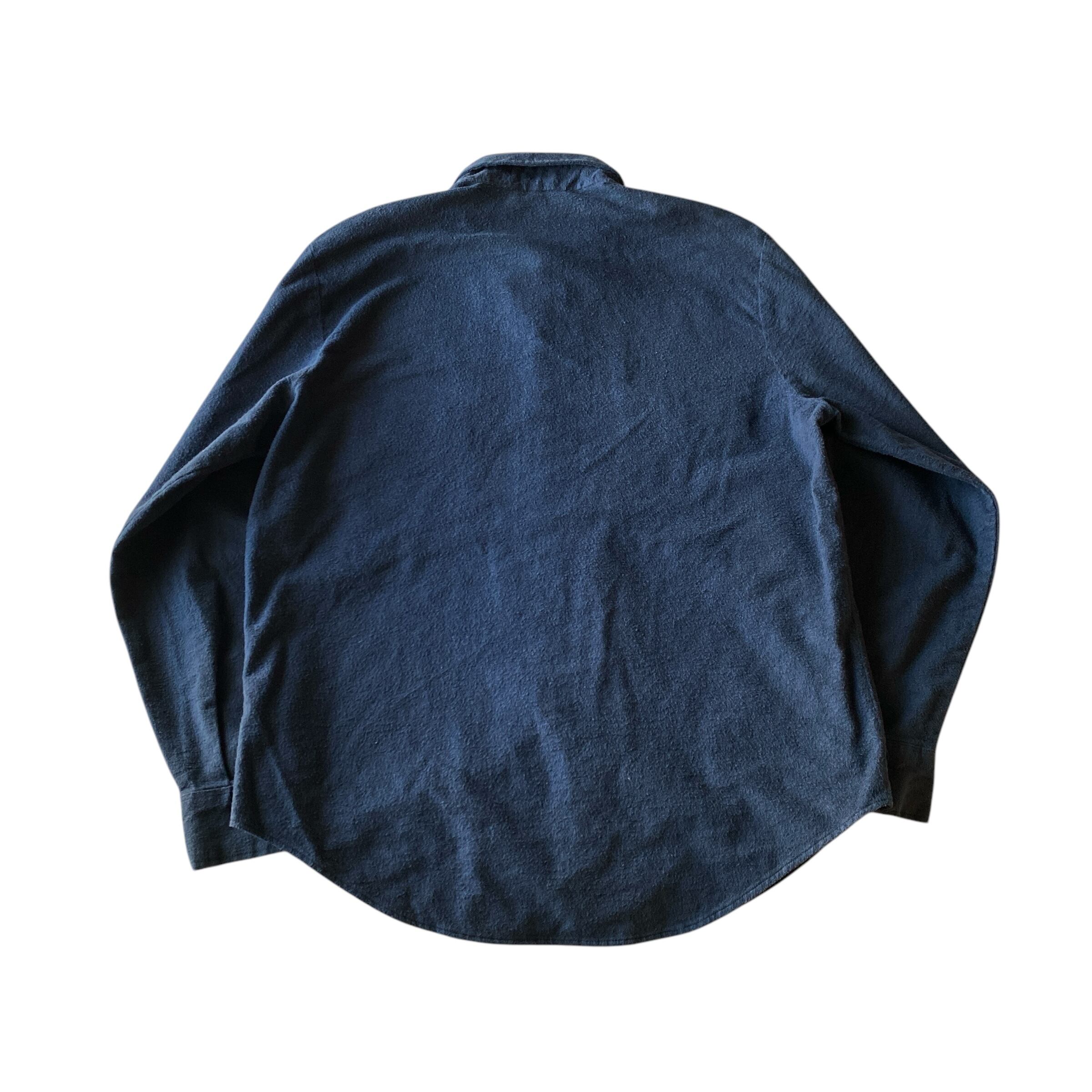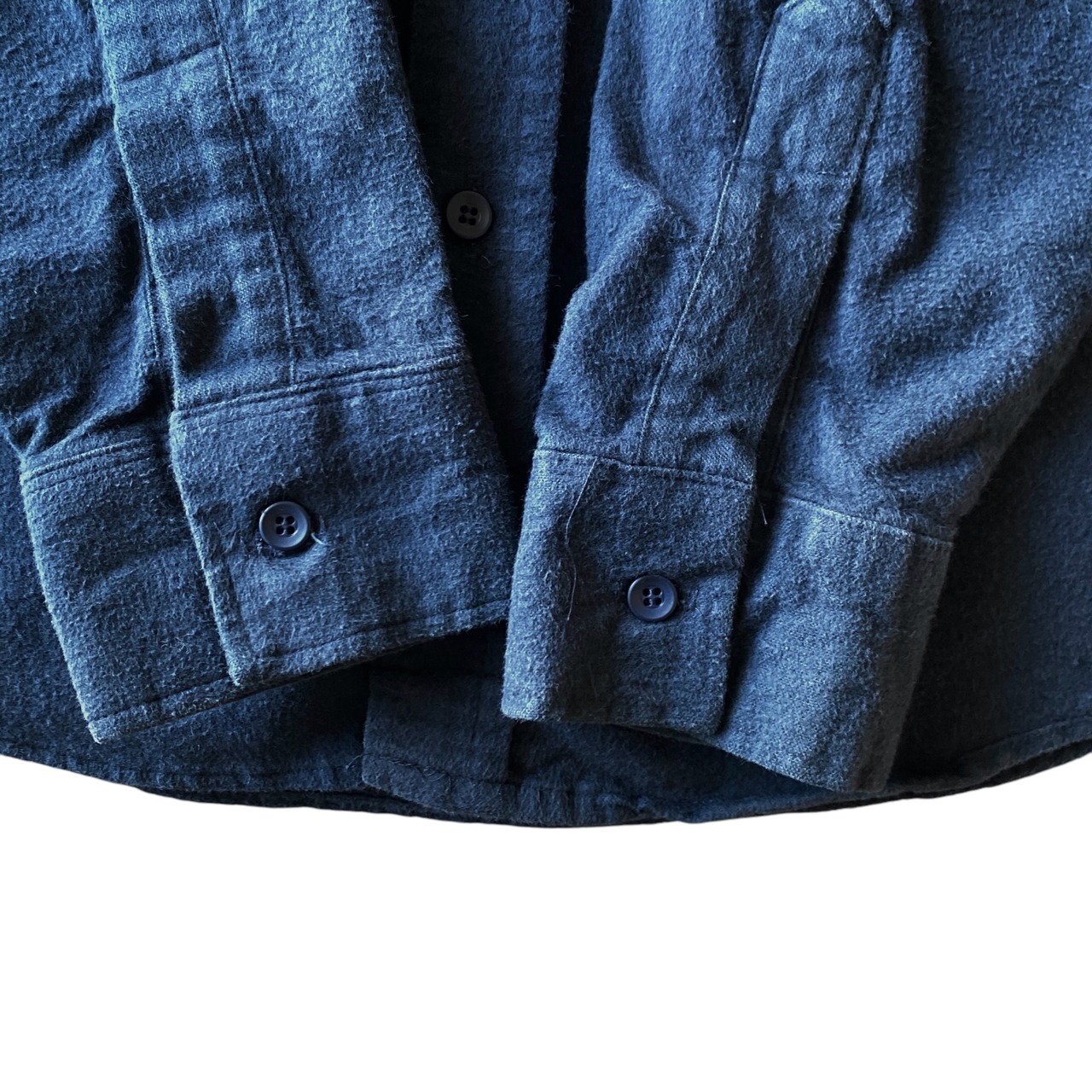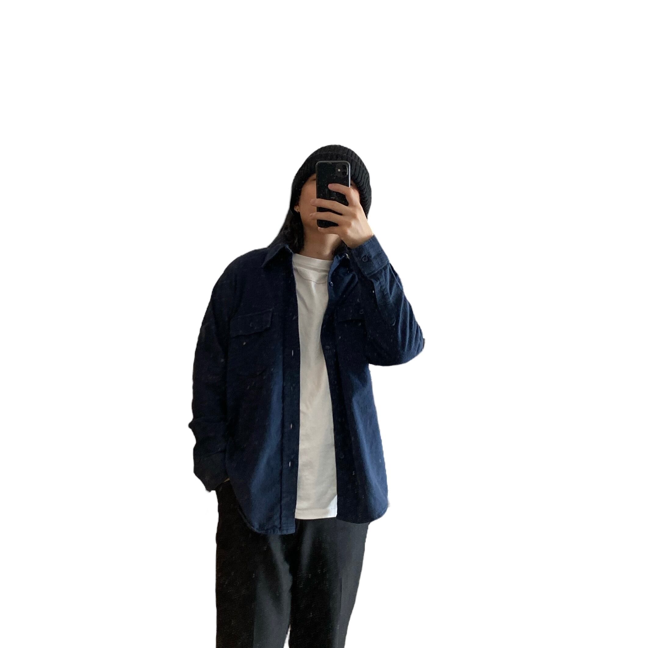 少しくすみ感のある上品なネイビーブルーカラーに、柔らかく肌触りの良いシャモア生地、程よくゆとりのあるベーシックなシルエットが非常に格好良い一着。