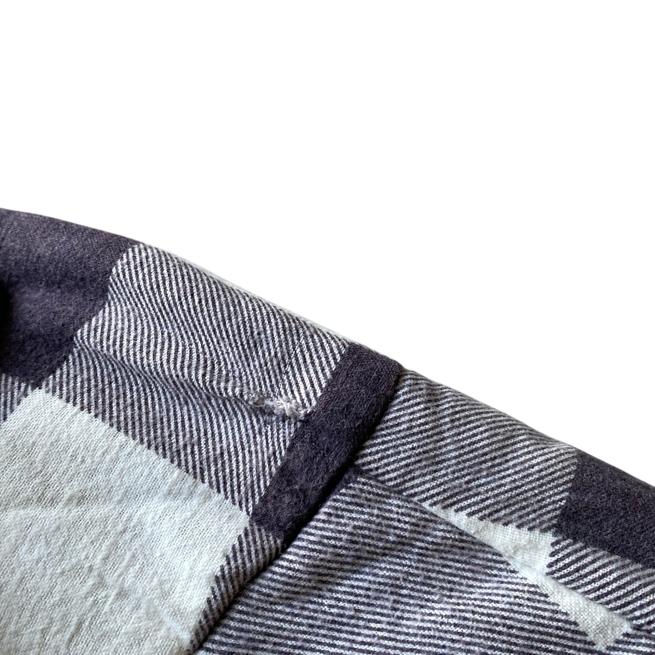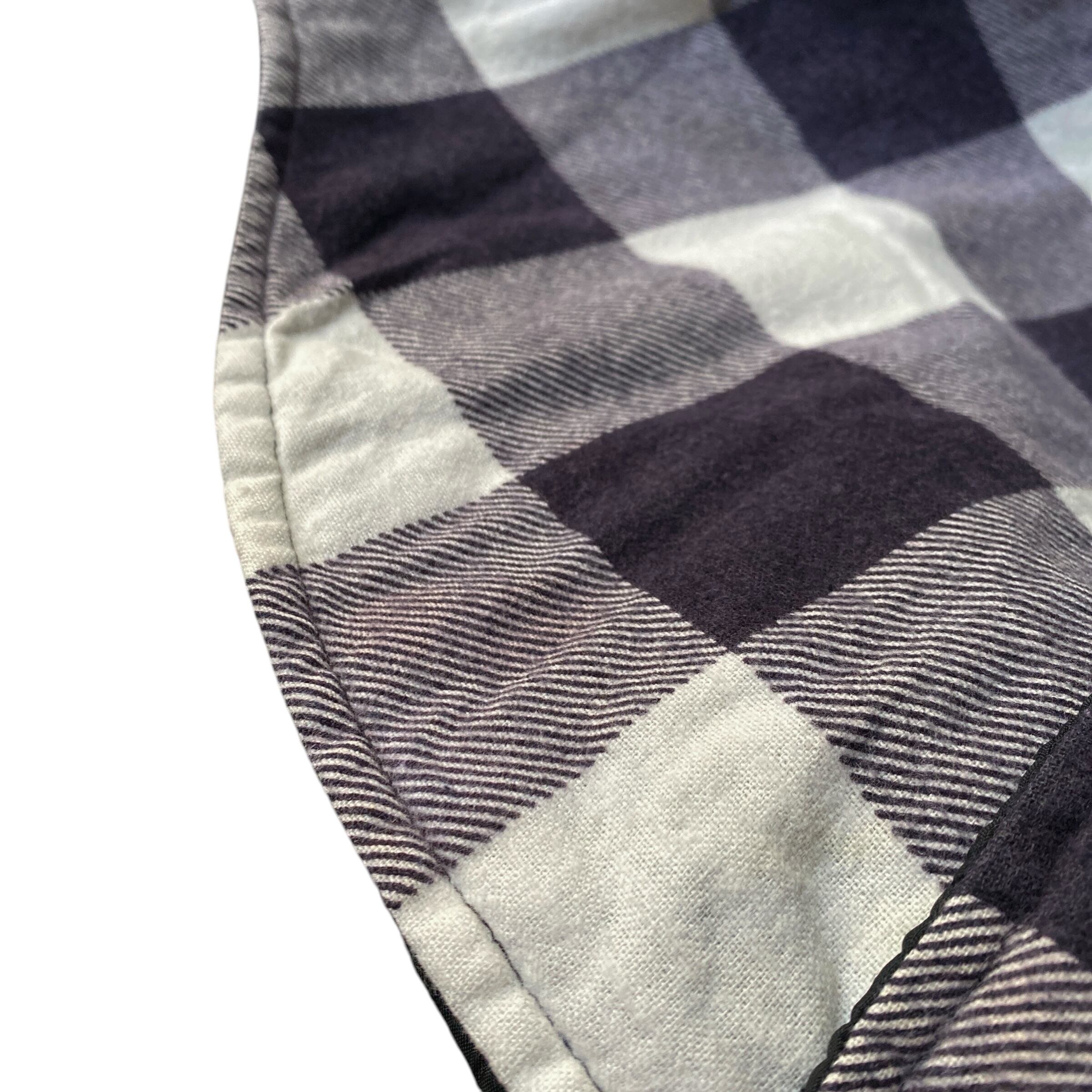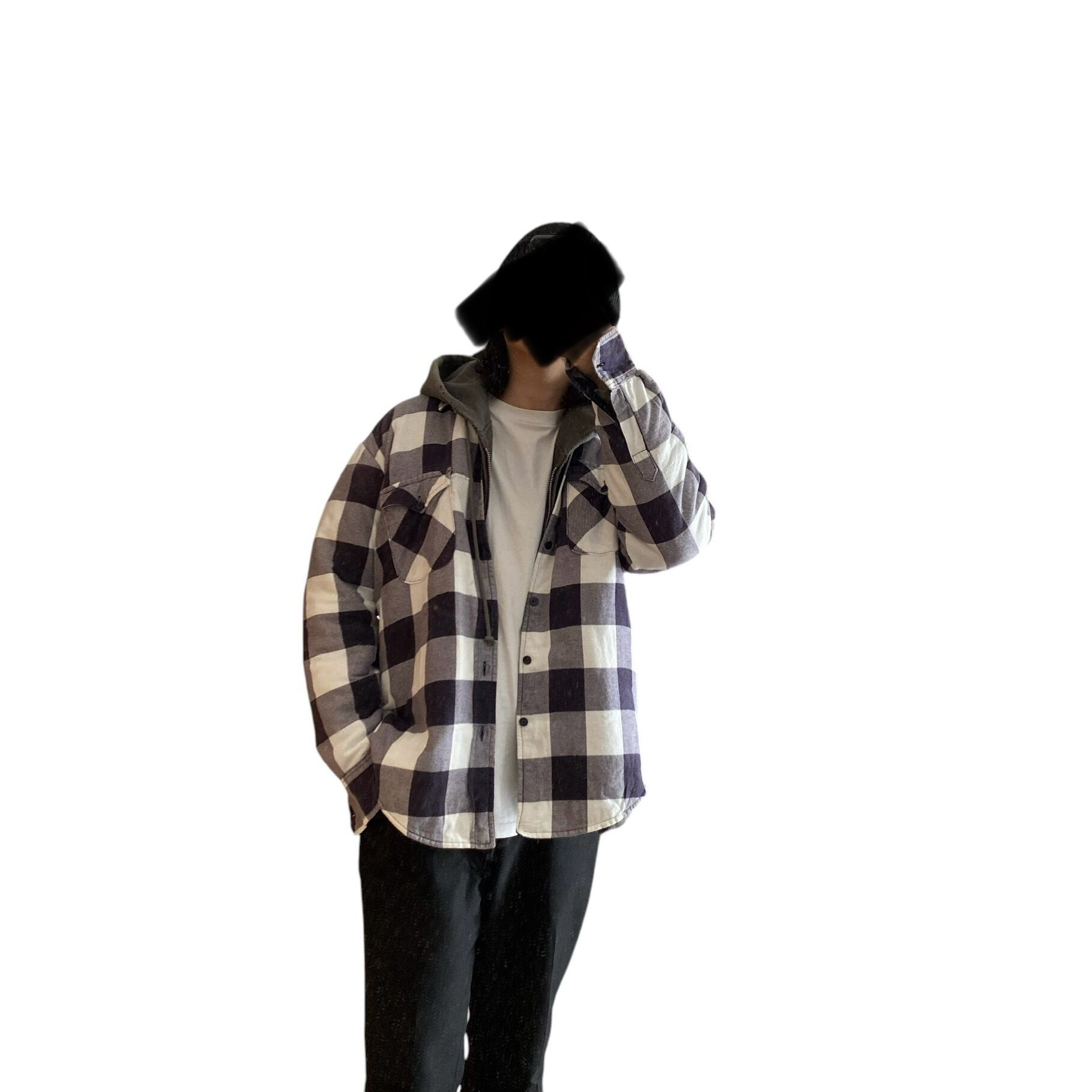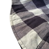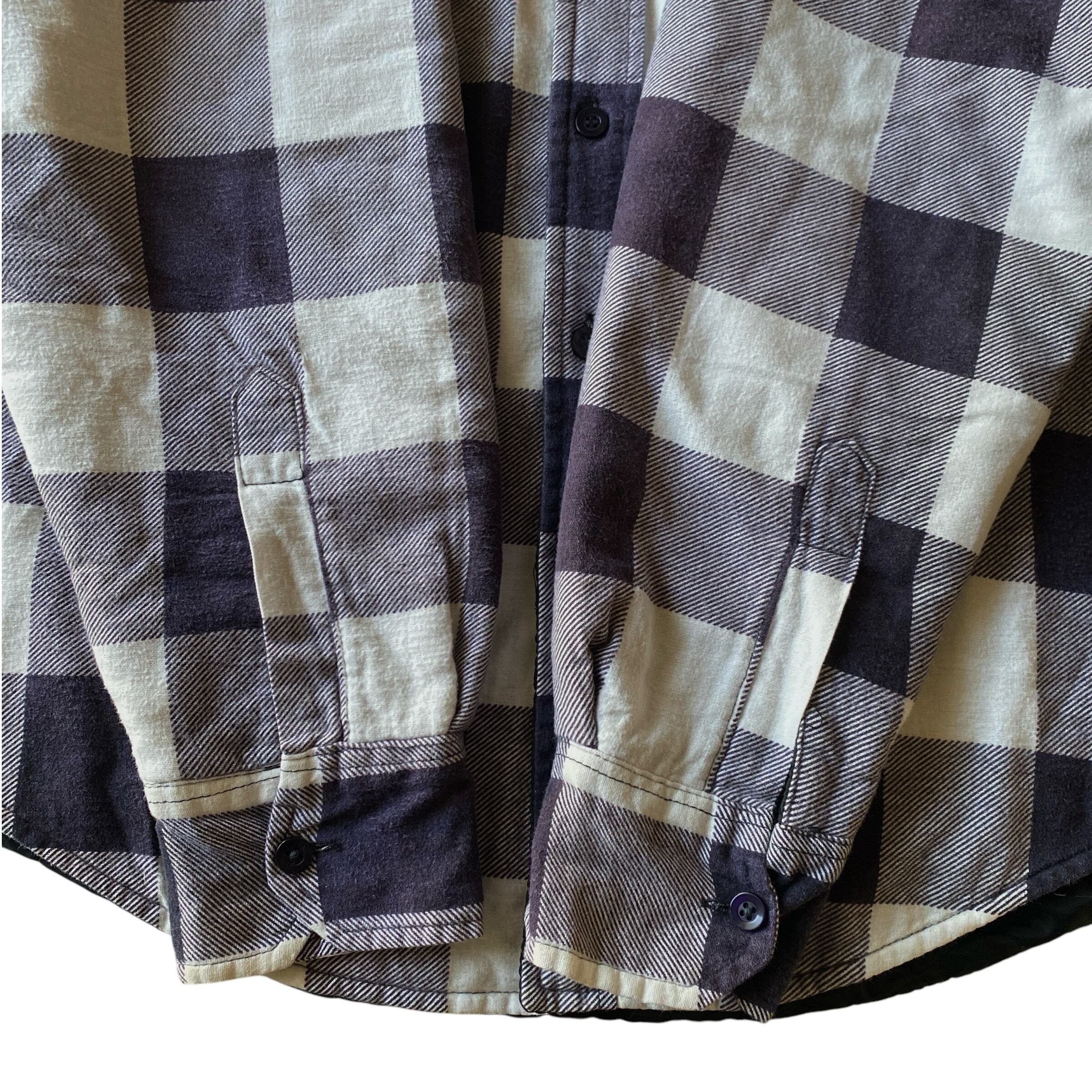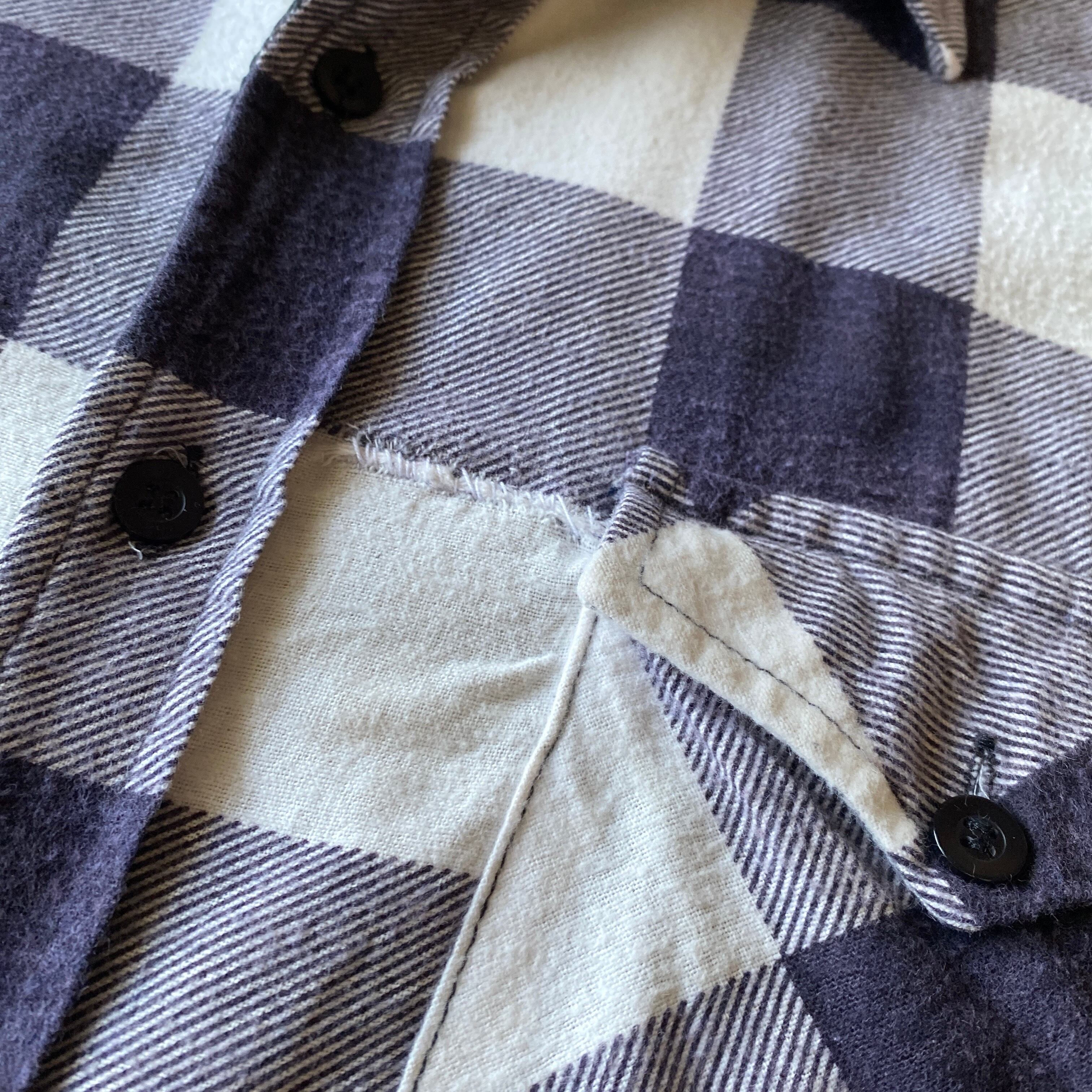 フワッと柔らかい風合いの良いコットンフランネル生地に、ブラックのキルティングライニング、ホワイト×パープルのブロックチェックが非常に格好良い一着。