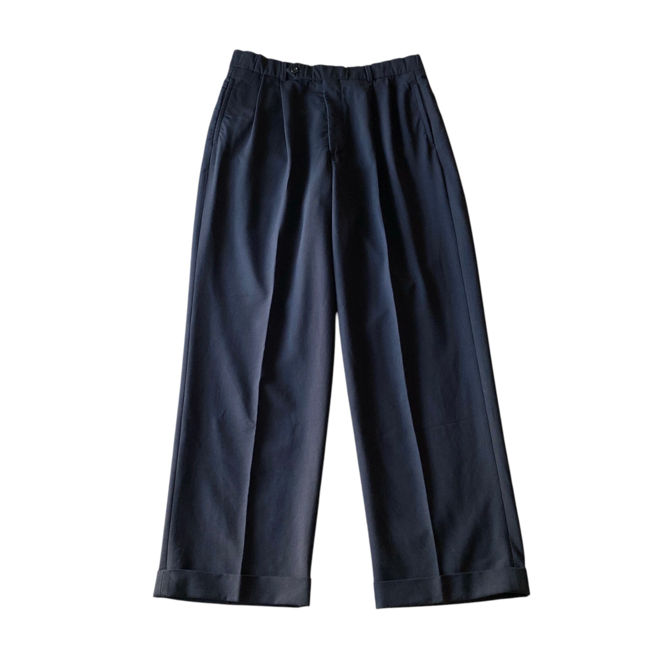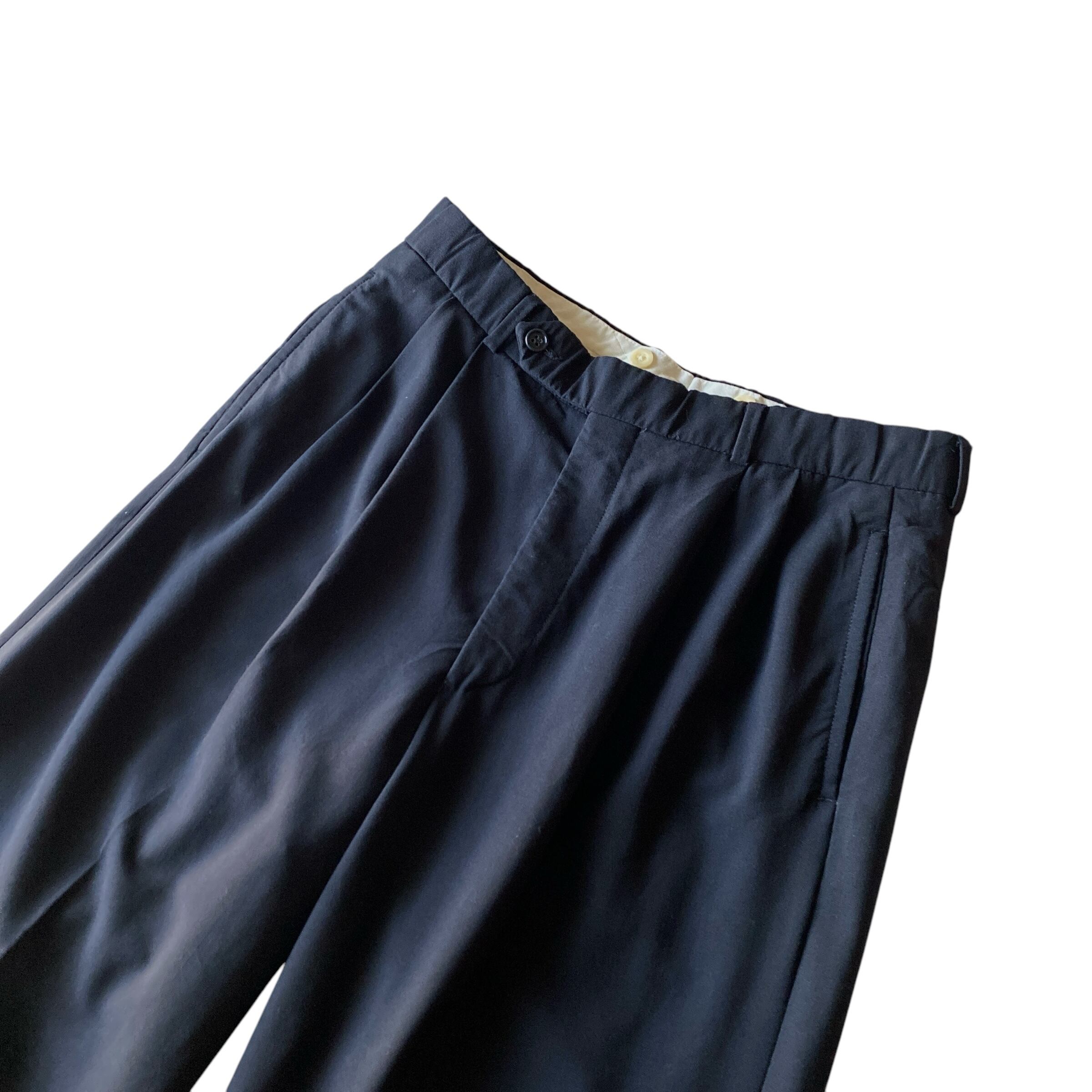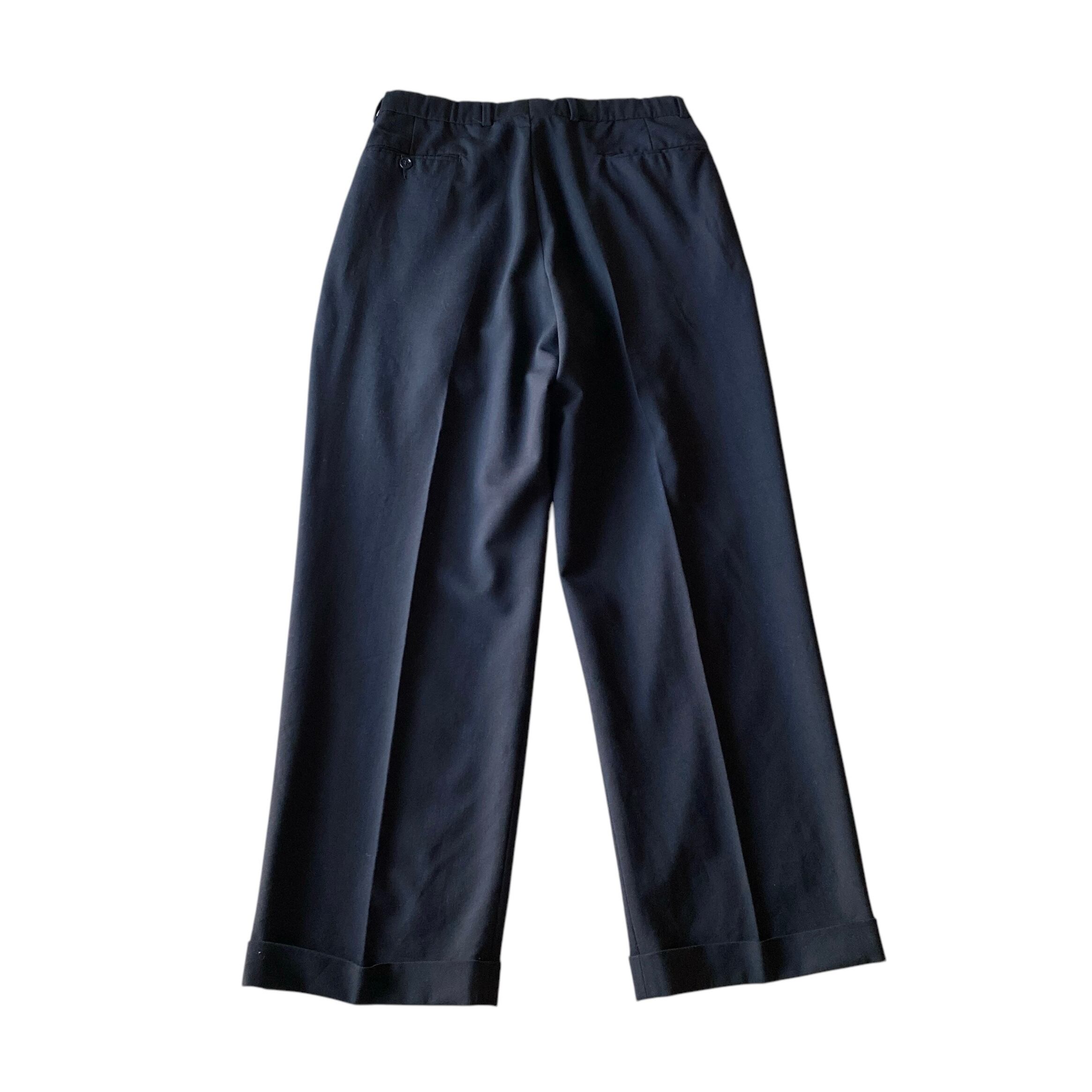 ブラックに近い深みのあるダークネイビーカラーに、程よい厚みでとろみのある平織りのウール生地、ゆったりとしたクラシックシルエットが非常に素晴らしい一本。
