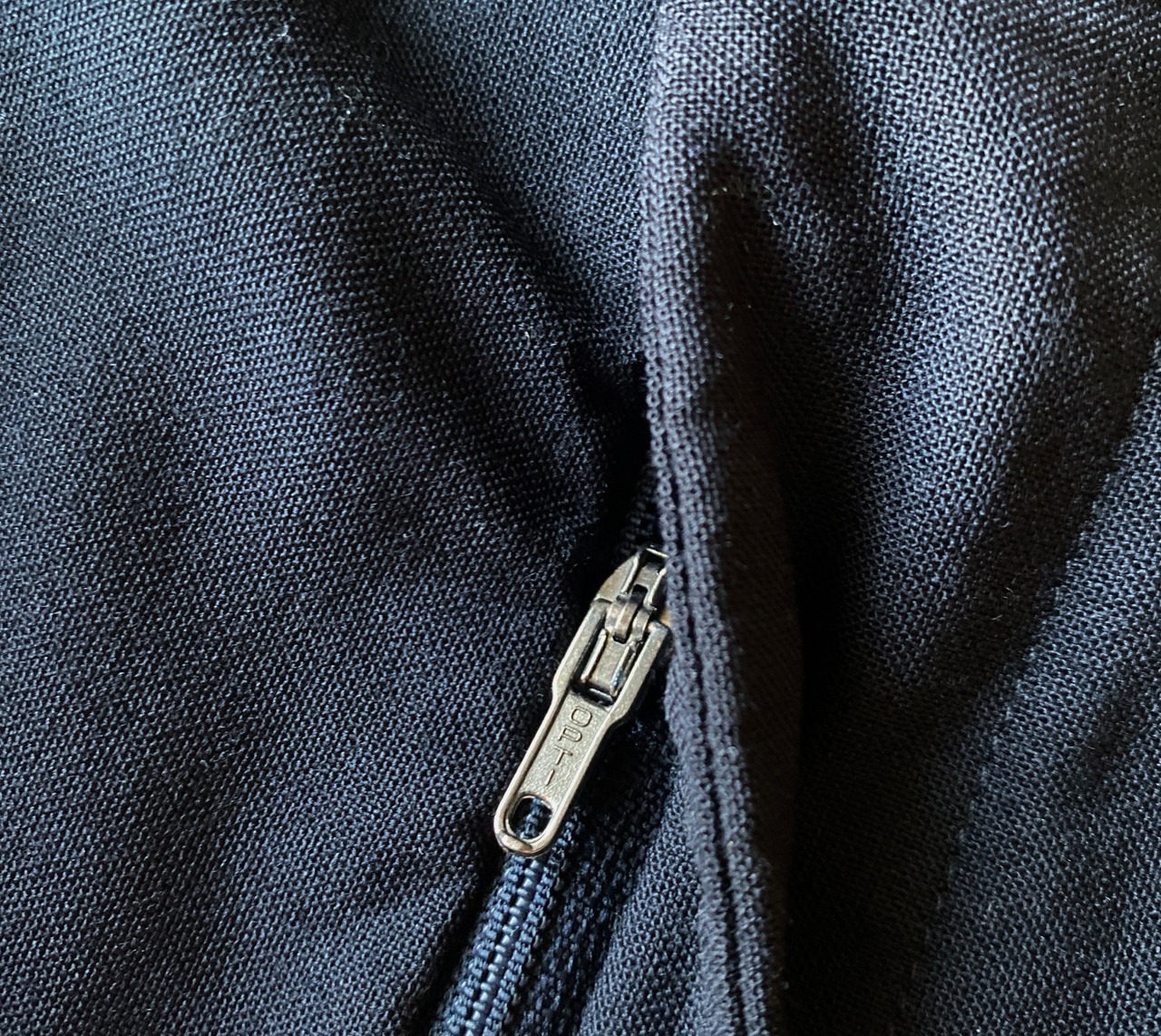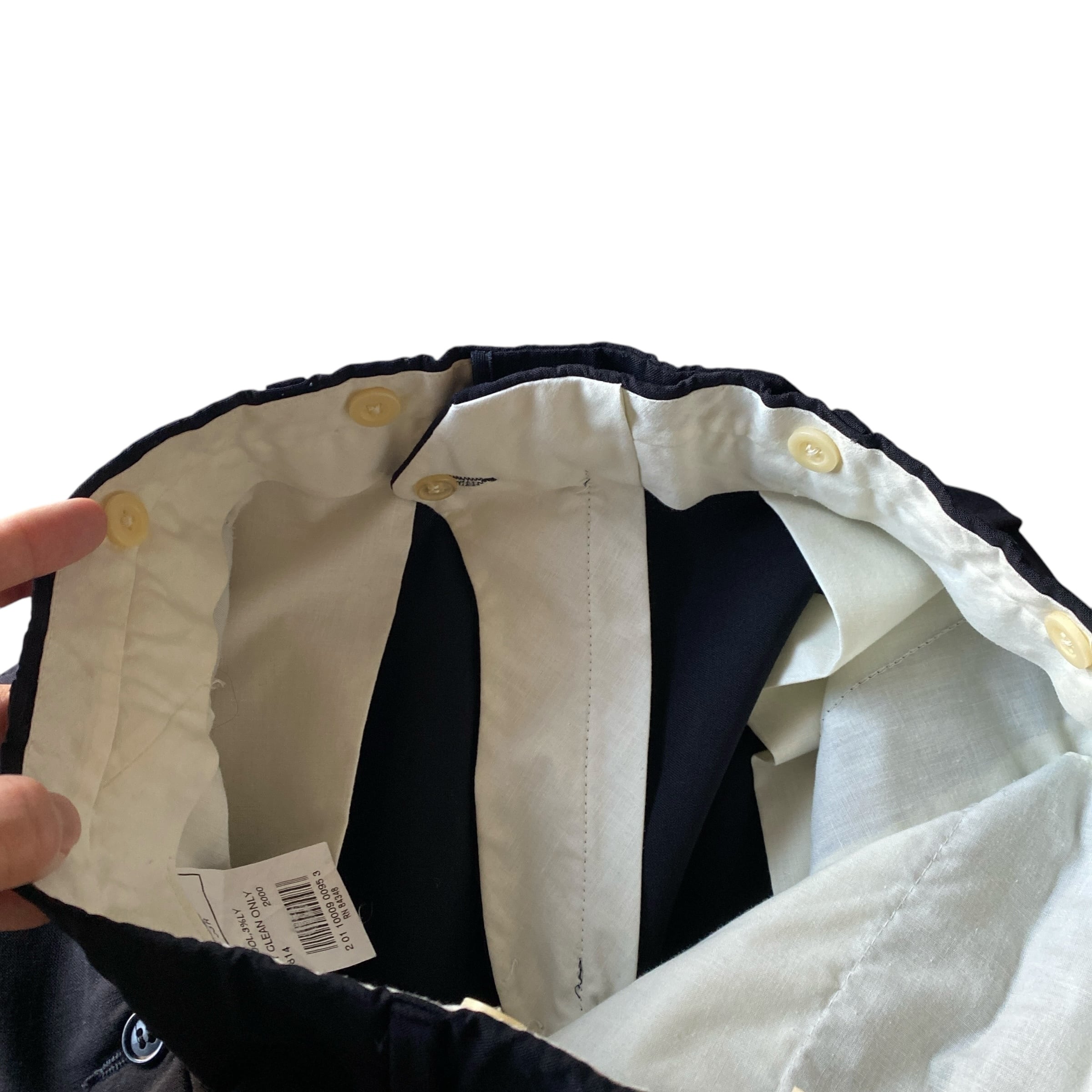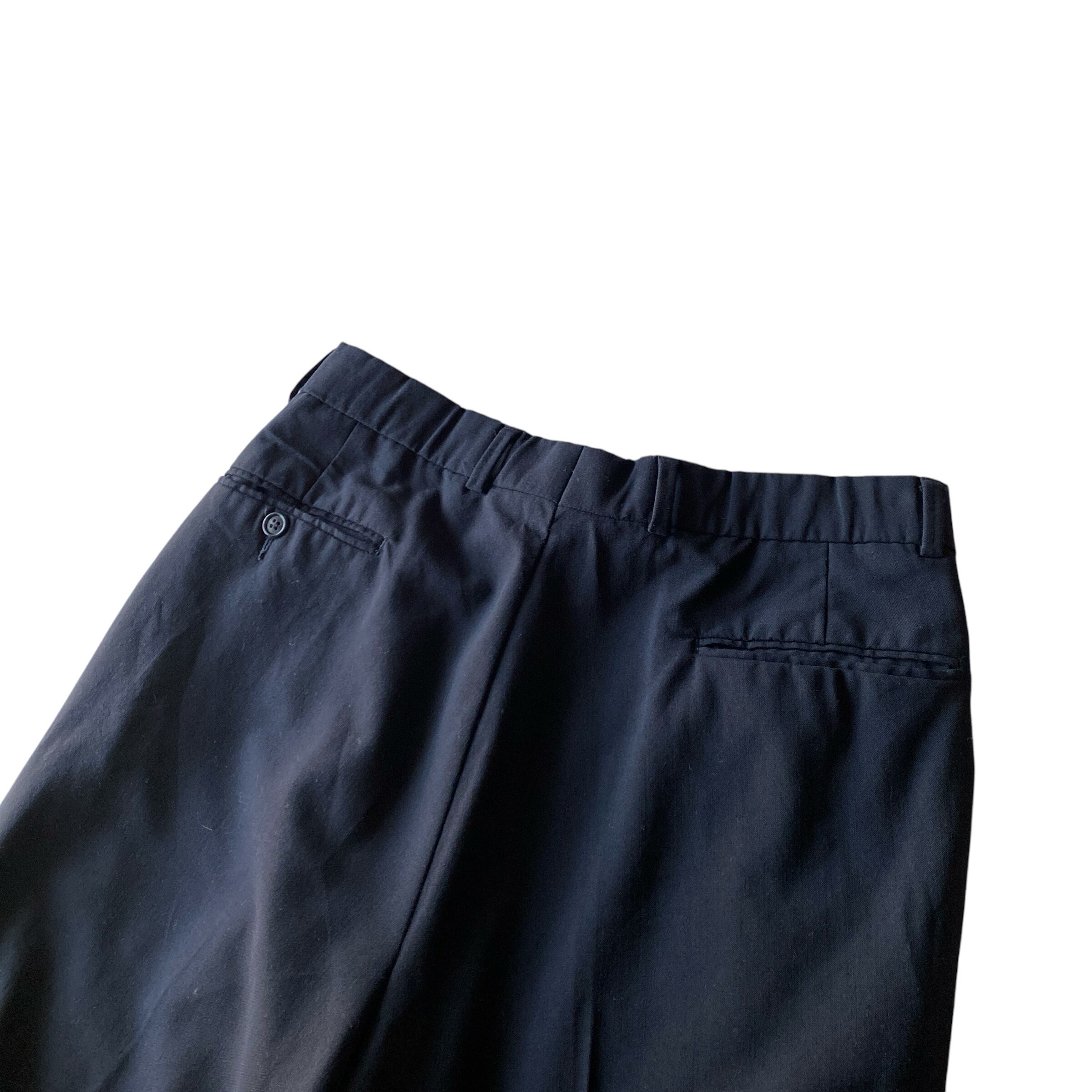 ブラックに近い深みのあるダークネイビーカラーに、程よい厚みでとろみのある平織りのウール生地、ゆったりとしたクラシックシルエットが非常に素晴らしい一本。