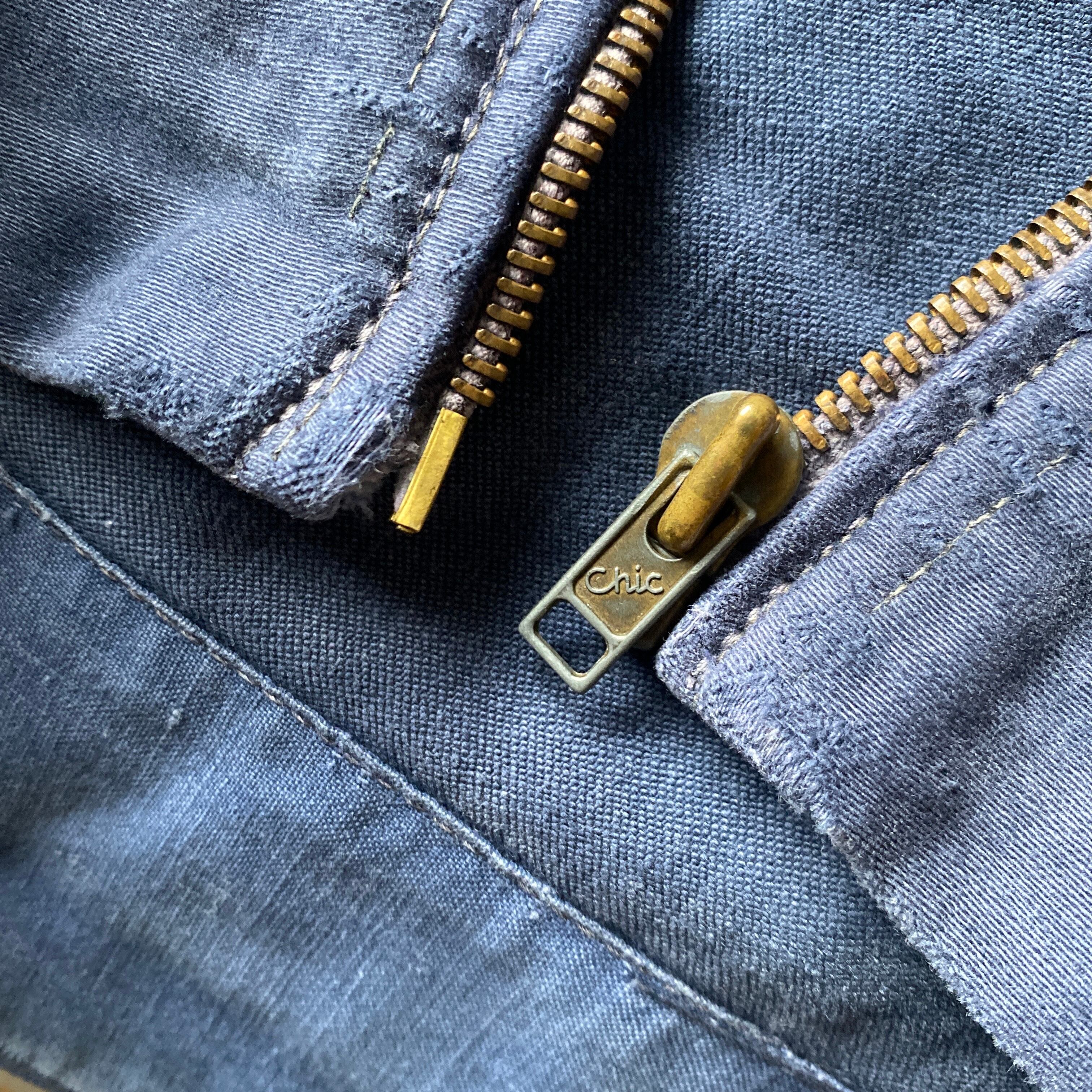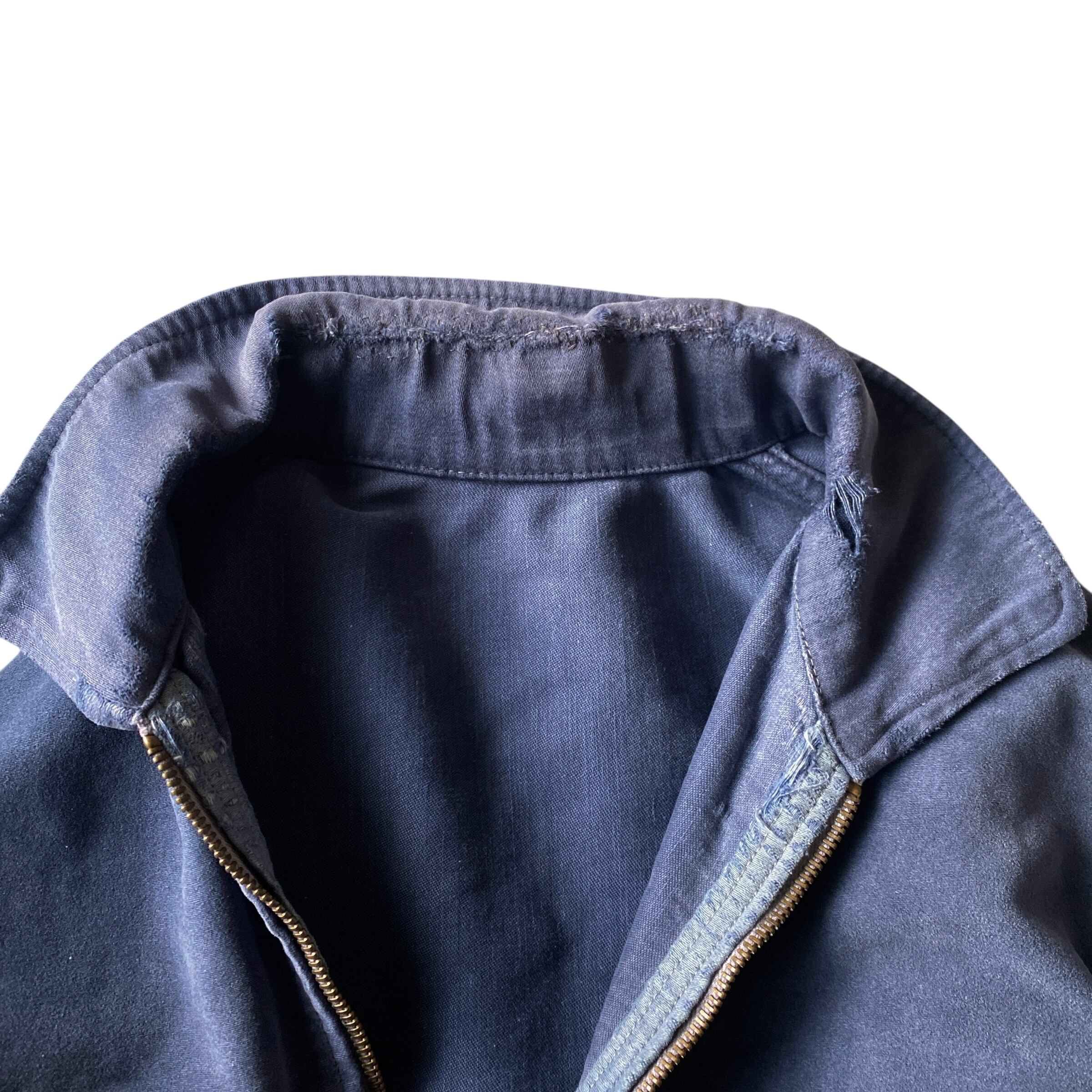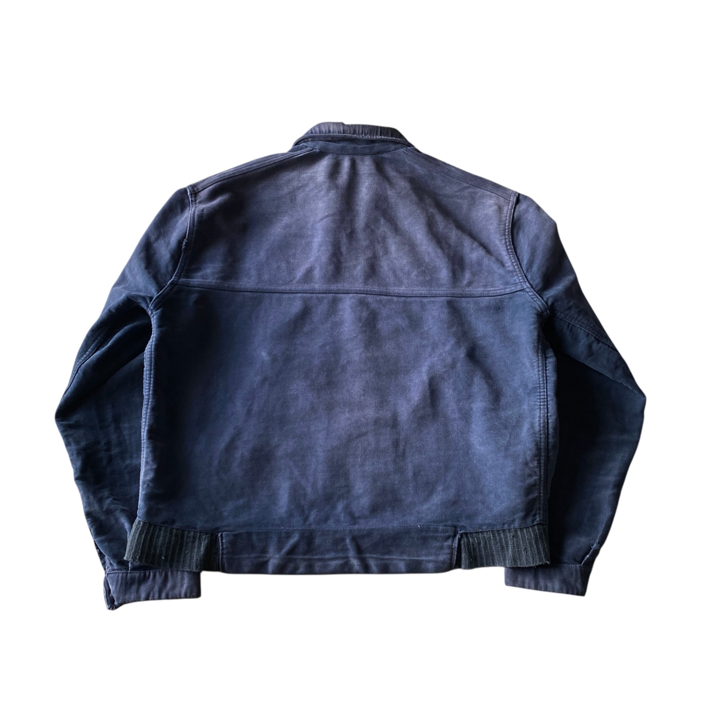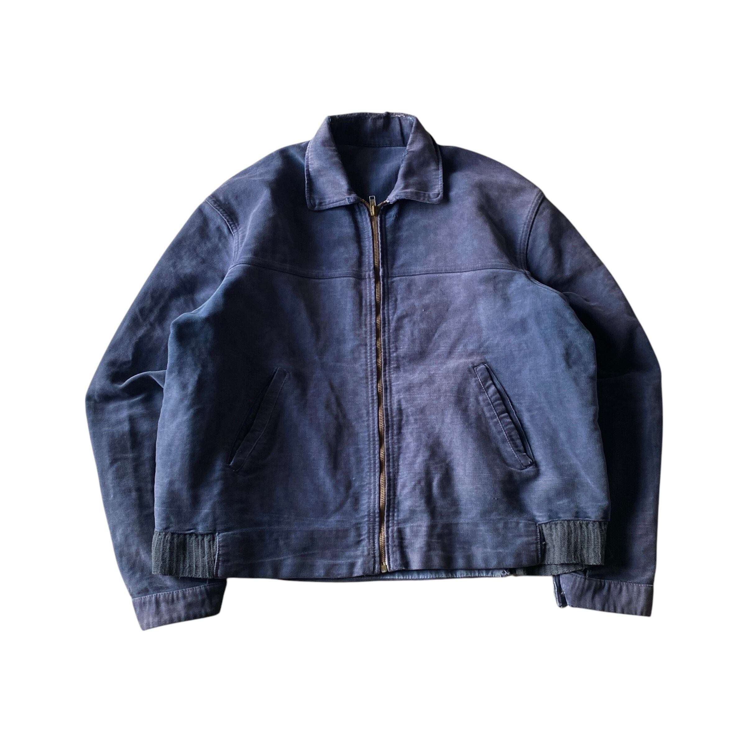 インクブルーがフェードした雰囲気抜群の色目、経年でギュッと目が詰まり、別珍かと思うほどに仕上がった生地の質感、珍しいフルジップで短丈ボックスなシルエットが素晴らしい一着。(一見サイクリストかと思いましたが全く別物です)