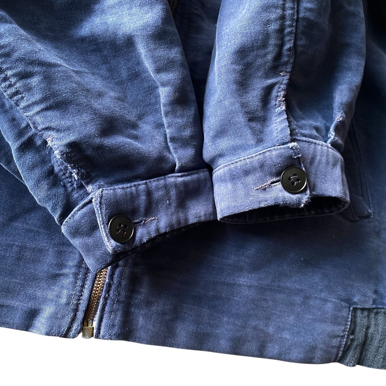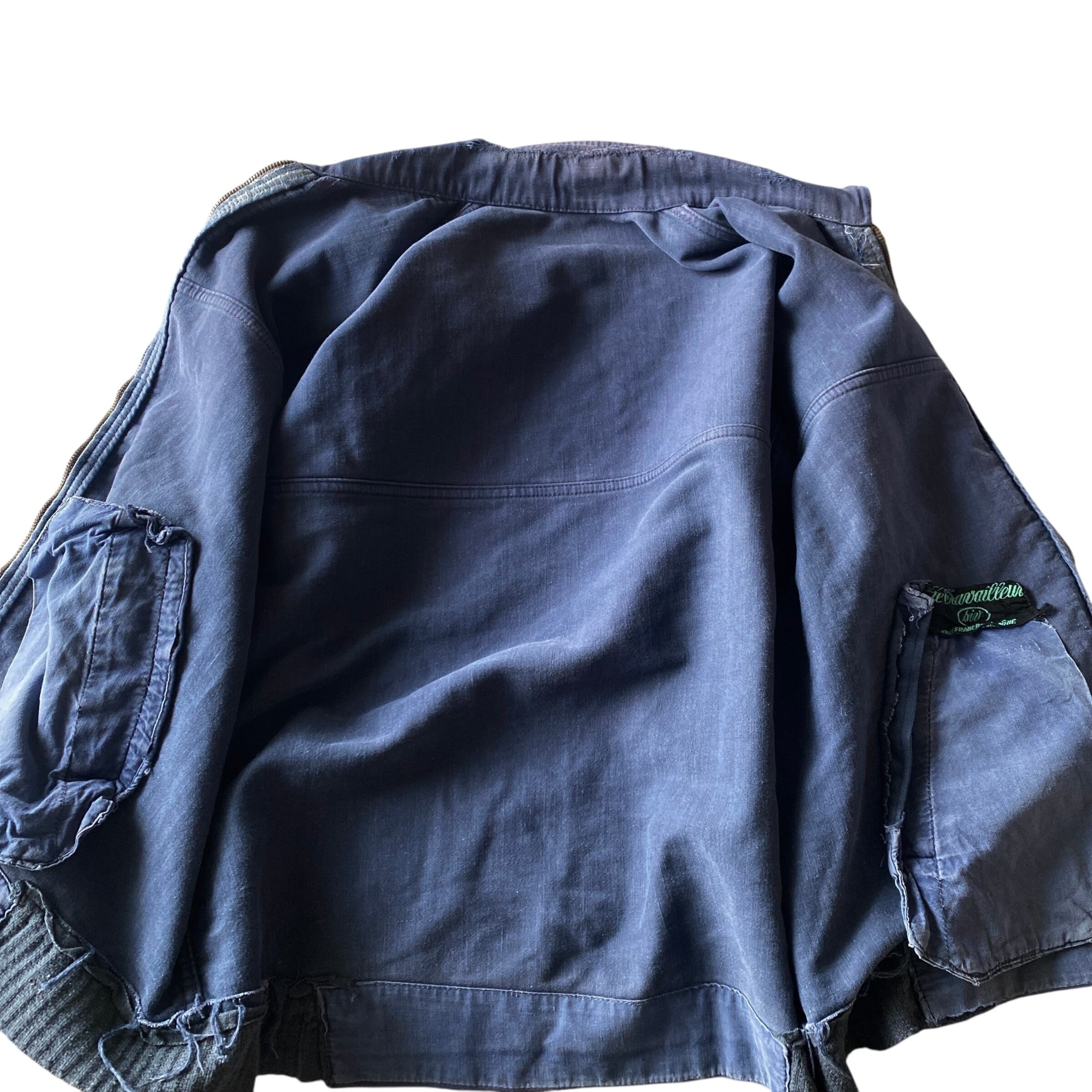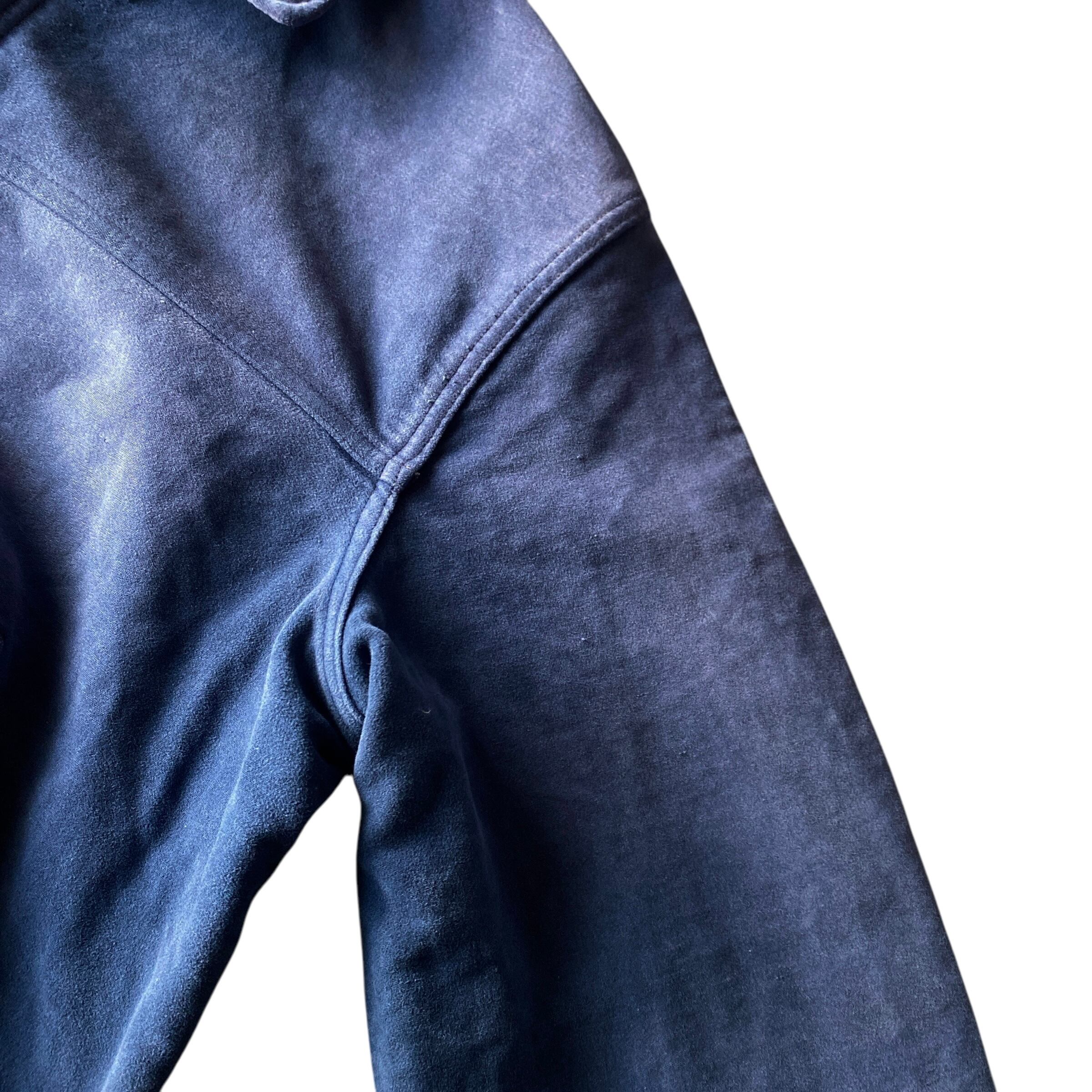 インクブルーがフェードした雰囲気抜群の色目、経年でギュッと目が詰まり、別珍かと思うほどに仕上がった生地の質感、珍しいフルジップで短丈ボックスなシルエットが素晴らしい一着。(一見サイクリストかと思いましたが全く別物です)