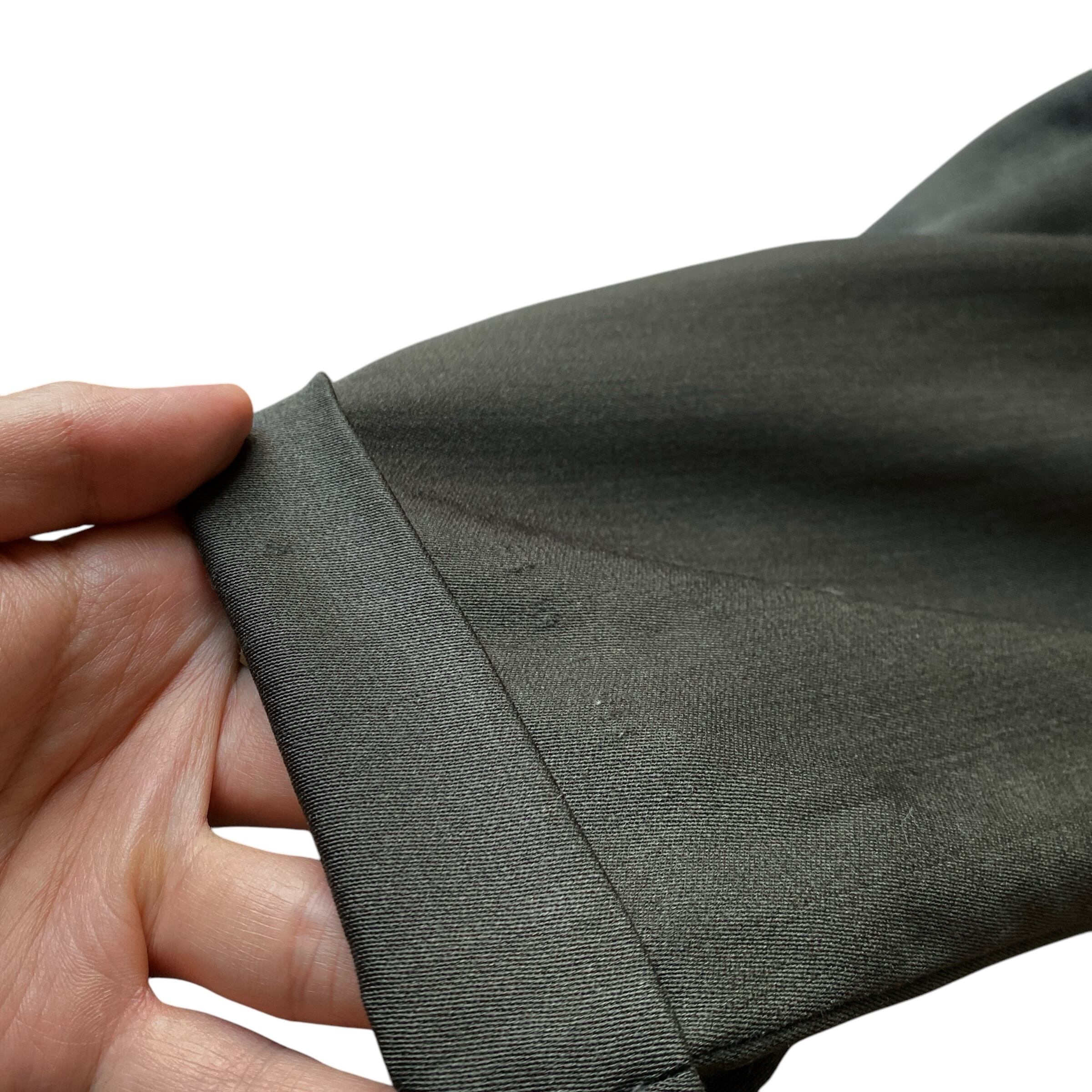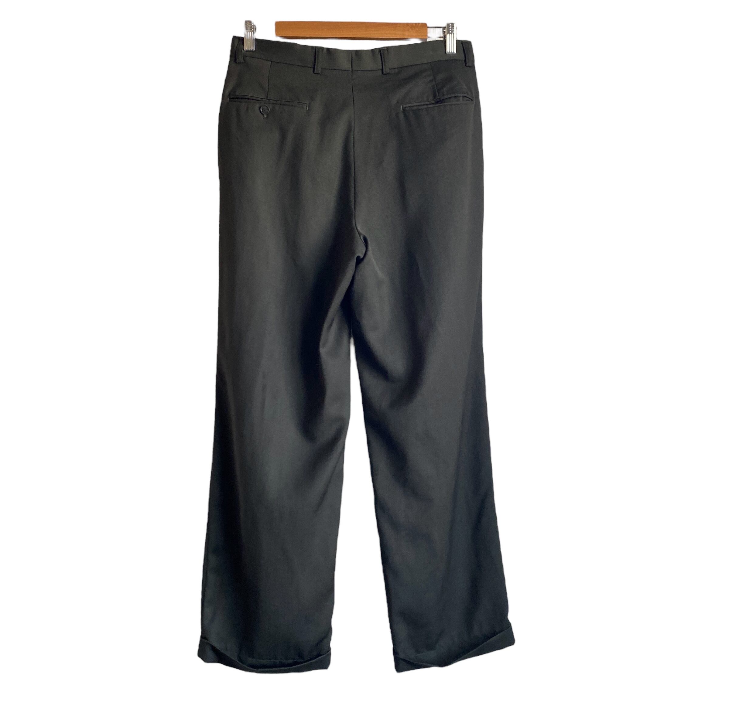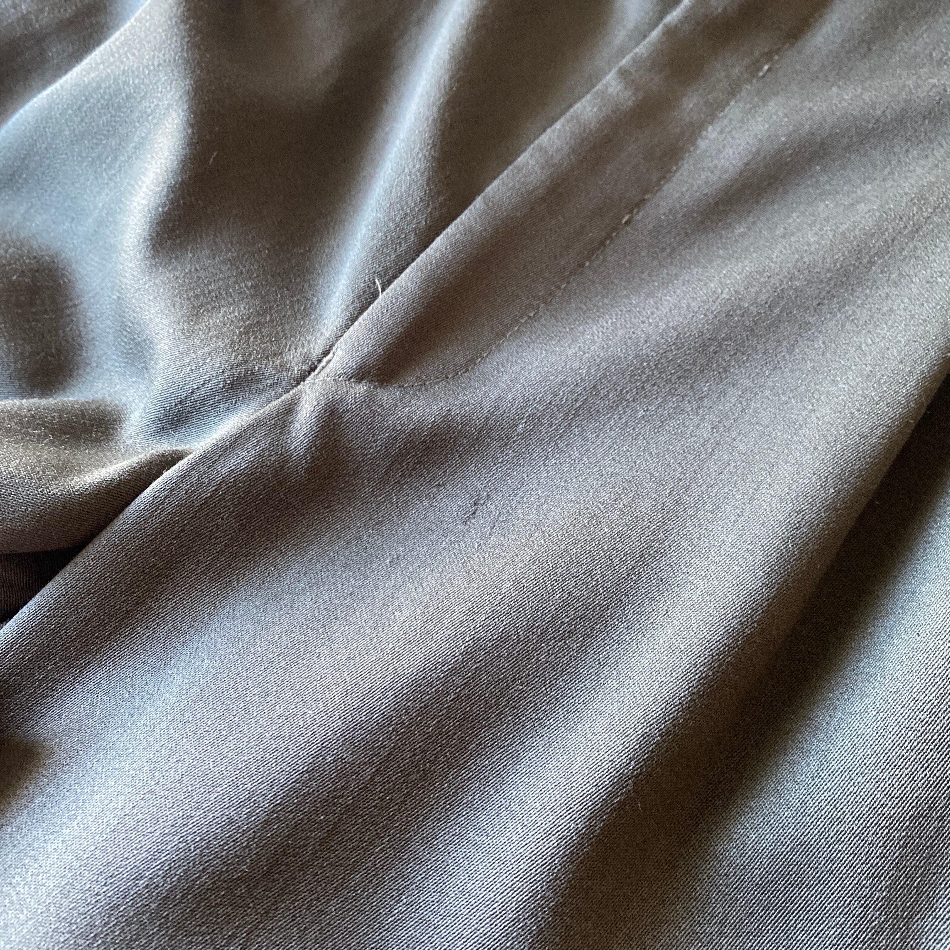 程よく肉厚でとろみのある極上のウールギャバジン生地に、上品なダークオリーブカラー、ゆったりとしたクラシックシルエットが非常に素晴らしい一本。(同年代のgivenchyのものにかなり近い生地感、シルエットです)